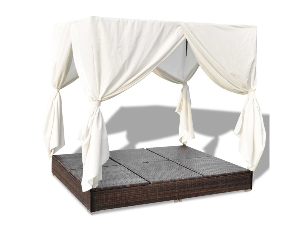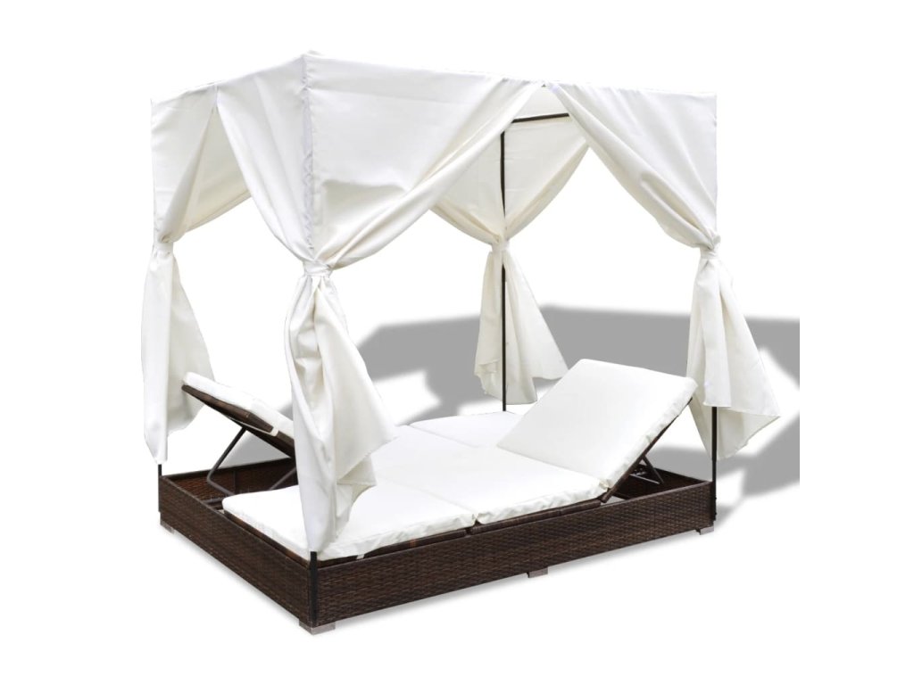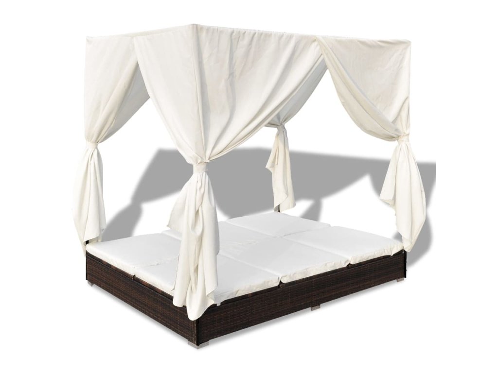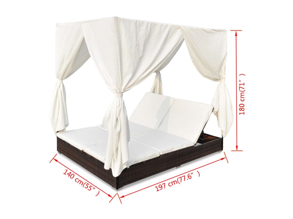 Vďaka oceľovým rámom s práškovou povrchovou úpravou je ležadlo veľmi stabilné a trvácne. Záhradné ležadlo z PE ratanu sa ľahko čistí a pohodlné hrubé a mäkké podložky sú vyrobené z vodovzdorného polyesteru. Poťahy na zips sú odnímateľné a dajú sa oprať. Dvojmiestna leňoška sa dá na obidvoch stranách nastaviť do 7 rôznych polôh, a tak poskytuje optimálny komfort pri sedení a ležaní. Závesy, ktoré visia zo štyroch stĺpikov rámu postele dodávajú ležadlu luxusný vzhľad, postarajú sa o to, aby sa dnu nedostal nepríjemný hmyz a zároveň vám poskytnú potrebný tieň a súkromie. Záves môžete zložiť dole a odložiť, ak si chcete naplno vychutnávať slnečné lúče. Záhradné ležadlo sa jednoducho montuje.