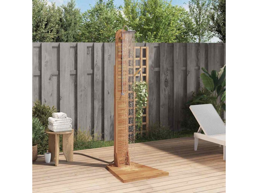 - Robustný materiál: Záhradná sprcha je vyhotovená z mimoriadne trvácneho tvrdého tíkového dreva, ktoré bolo umelo vysušené v sušiarni a jeho povrch bol následne jemne obrúsený, aby získal hladký vzhľad. Tíkové drevo sa vyznačuje výnimočnou pevnosťou a odolnosťou voči poveternostným vplyvom, a tak predstavuje jeden z najvhodnejších materiálov na výrobu záhradných doplnkov spomedzi všetkých ostatných druhov dreva. Ak si chcete zaobstarať záhradnú sprchu, ktorá vám bude slúžiť dlhé roky, tíkové drevo je pre vás ako stvorené. Rúrka je vyrobená z nehrdzavejúcej ocele.