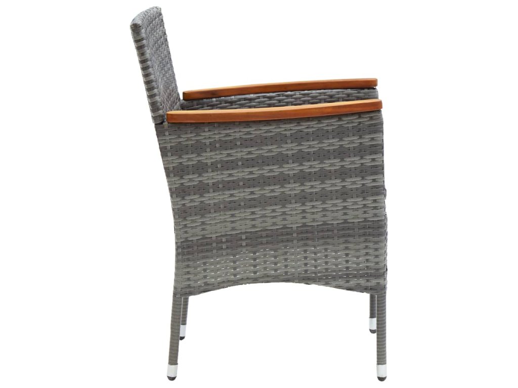 Robustný oceľový rám je obalený v PE ratane, ktorý je odolný voči poveternostným vplyvom. Táto sada záhradných stoličiek je odolná voči hrdzi a plesniam, a poskytne vám roky kvalitného odpočinku. Táto súprava vonkajších stoličiek, ktorá má zaoblené operadlo a lakťovú opierku, má ergonomický tvar pre maximálne pohodlie. Opierky sú nádherne zdobené masívnym akáciovým drevom s olejovou povrchovou úpravou, čo im dodáva rustikálny šarm. Pevné polstrované vankúše navyše poskytujú maximálne pohodlie počas sedenia.