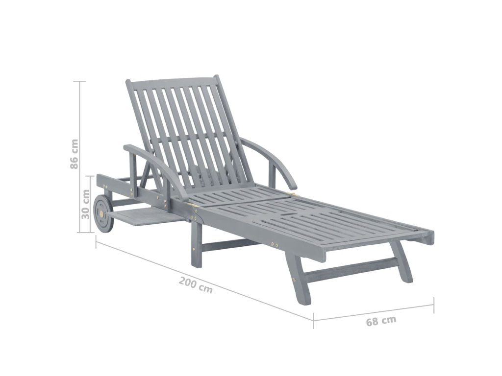 Toto vonkajšie ležadlo je vyrobené z masívneho akáciového dreva so sivým premývaným náterom, vďaka čomu je robustné a stabilné. Operadlo a opierka nôh sú nastaviteľné a lehátko môžete zaistiť v požadovanej polohe. Toto záhradné ležadlo sa dá ľahko premiestňovať po dome pomocou 2 koliesok. Lehátko má pohodlný výsuvný stolík na umiestnenie telefónu, slnečných okuliarov, nápojov a iných drobností. Vankúš vám dodá ďalšie pohodlie počas oddychu. Každý vankúš je vybavený dvoma sadami šnúrok, aby ste ho mohli pevne pripevniť k lehátku.