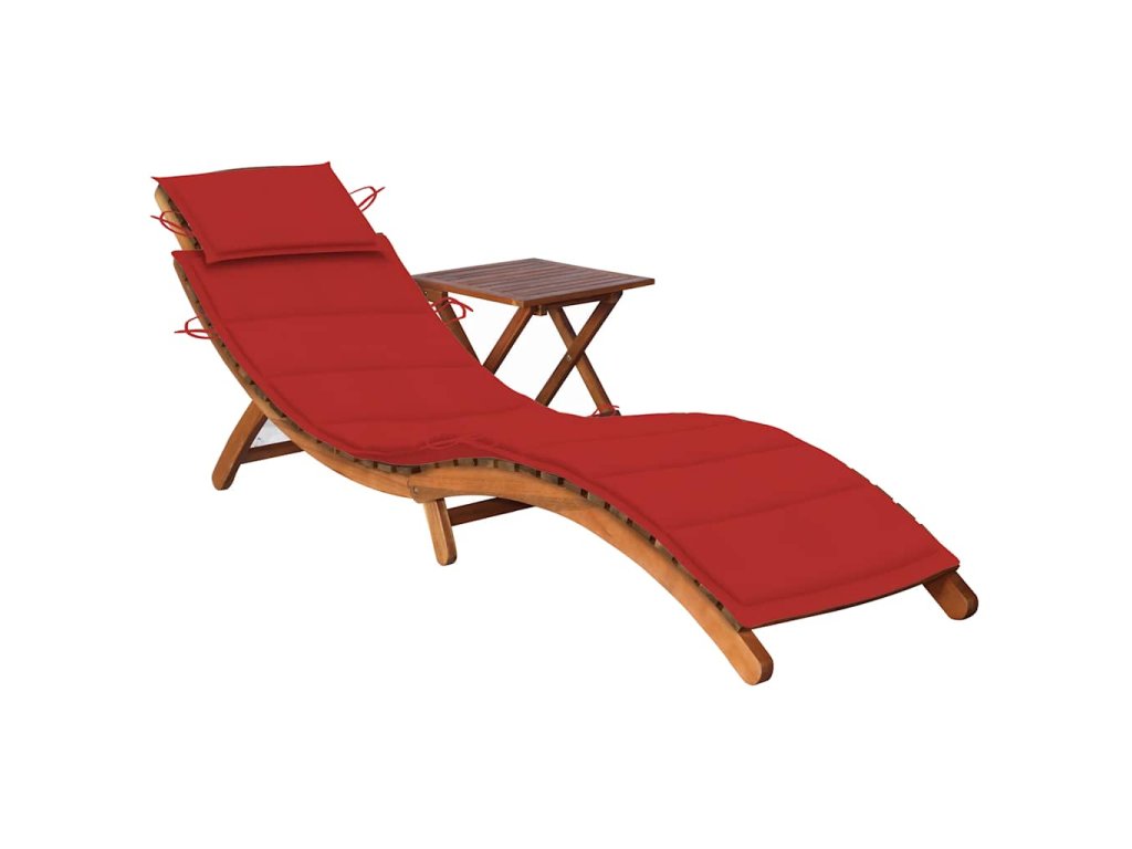Vonkajšie ležadlo a stolík sú vyrobené z masívneho akáciového dreva, vďaka čomu sú pevné a stabilné. Toto lehátko má ergonomicky zakrivený tvar, ktorý vám umožní ľahnúť si a úplne relaxovať. Lehátko a stolík je možné zložiť, ak ich nepoužívate. Vankúš s podhlavníkom vám dodá väčšie pohodlie pri leňošení. Každý vankúš je vybavený šiestimi sadami šnúrok, aby ste ho mohli pevne pripevniť na lehátku.