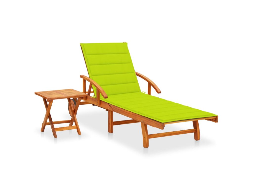 Toto záhradné lehátko so stolíkom je vyrobené z masívneho akáciového dreva, vďaka čomu je pevné a stabilné. Záhradné lehátko sa dá ľahko premiestňovať pomocou 2 koliesok. Operadlo a opierka nôh sú nastaviteľné a tiež môžete drevené ležadlo uzamknúť do požadovanej polohy. Výsuvný a skladací bočný stolík vám umožní odložiť si telefón, slnečné okuliare, nápoj a iné drobné predmety. Vankúš zvyšuje pohodlie pri oddychu. Každý vankúš obsahuje dvoma šnúrok, pomocou ktorých ho pevne pripevníte k lehátku.