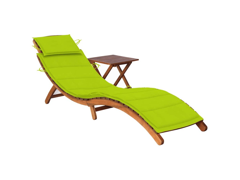 Vonkajšie ležadlo a stolík sú vyrobené z masívneho akáciového dreva, vďaka čomu sú pevné a stabilné. Toto lehátko má ergonomicky zakrivený tvar, ktorý vám umožní ľahnúť si a úplne relaxovať. Lehátko a stolík je možné zložiť, ak ich nepoužívate. Vankúš s podhlavníkom vám dodá väčšie pohodlie pri leňošení. Každý vankúš je vybavený šiestimi sadami šnúrok, aby ste ho mohli pevne pripevniť na lehátku.