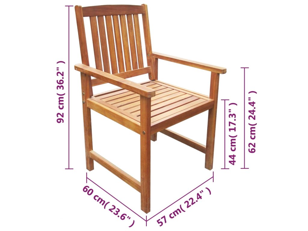 Stoličky sú vyrobené z akáciového masívu, vďaka čomu sú trvácne, robustné a ľahko sa čistia. S touto klasickou súpravou záhradných stoličiek si budete môcť vychutnať príjemnú večeru na čerstvom vzduchu alebo si na nej oddýchnuť a užívať si pekné počasie.