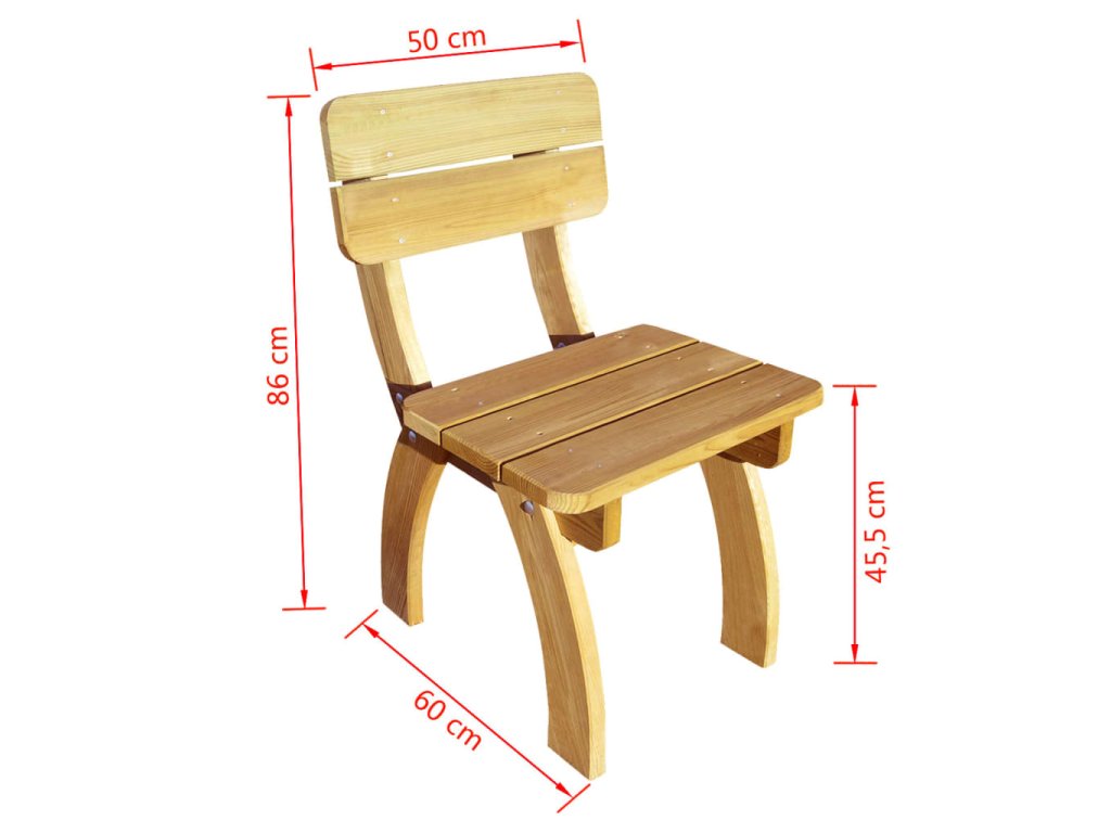 Drevené záhradné stoličky sú vyrobené z vysokokvalitného borovicového dreva so zelenou impregnáciou, a preto sú veľmi pevné, trvácne a odolné voči hnilobe.