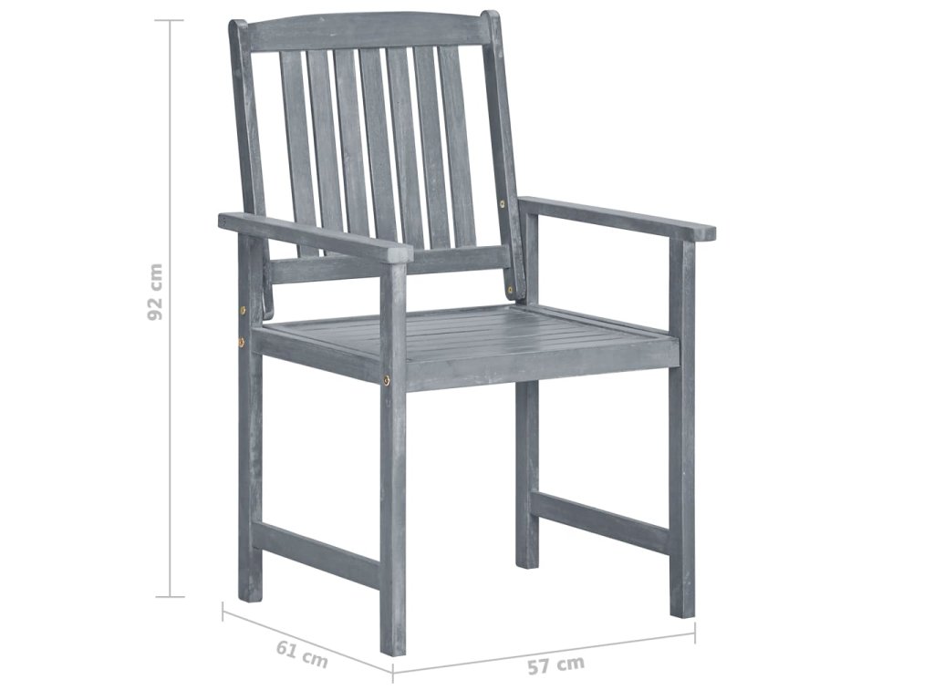 Táto sada vonkajších stoličiek je vyrobená z masívneho akáciového dreva so sivou povrchovou úpravou, čo je tvrdé drevo s bohatou textúrou. Masívne akáciové drevo tiež znesie vyššiu záťaž a odoláva opotrebovaniu časom. Táto sada drevených stoličiek je stabilná, trvácna a odolná voči poveternostným vplyvom. Povrch stoličky sa navyše ľahko čistí vlhkou handričkou. Dodané podušky poskytujú extra pohodlie.