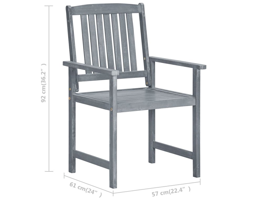 Táto sada vonkajších stoličiek je vyrobená z masívneho akáciového dreva so sivou povrchovou úpravou, čo je tvrdé drevo s bohatou textúrou. Masívne akáciové drevo tiež znesie vyššiu záťaž a odoláva opotrebovaniu časom. Táto sada drevených stoličiek je stabilná, trvácna a odolná voči poveternostným vplyvom. Povrch stoličky sa navyše ľahko čistí vlhkou handričkou. Dodané podušky poskytujú extra pohodlie.