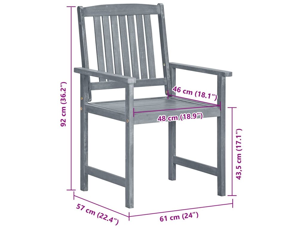 Táto sada vonkajších stoličiek je vyrobená z masívneho akáciového dreva so sivou povrchovou úpravou, čo je tvrdé drevo s bohatou textúrou. Masívne akáciové drevo tiež znesie vyššiu záťaž a odoláva opotrebovaniu časom. Táto sada drevených stoličiek je stabilná, trvácna a odolná voči poveternostným vplyvom. Povrch stoličky sa navyše ľahko čistí vlhkou handričkou. Dodané podušky poskytujú extra pohodlie.
