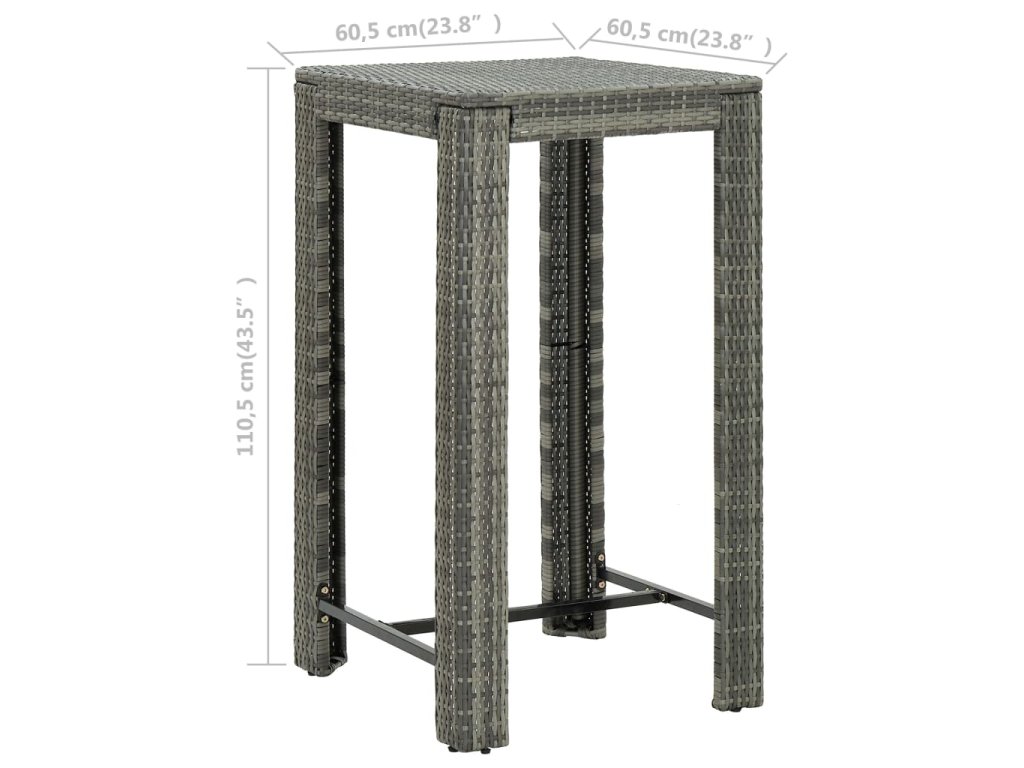 Stolík je vyrobený z oceľového rámu s práškovým nástrekom, vďaka čomu je stabilný, odolný a vhodný pre vnútorné aj vonkajšie použitie. Stolík je vyrobený z odolného PE ratanu a je odolný voči opotrebovaniu a ideálny pre každodenné vonkajšie použitie. Ľahko sa čistí vlhkou handričkou. Robustná stolová doska je ideálna na umiestnenie nápojov, jedla, váz a pod. Vďaka ľahkej ratanovej konštrukcii je možné barový stôl posunúť tak, aby sa hodil do rôznych priestorov.