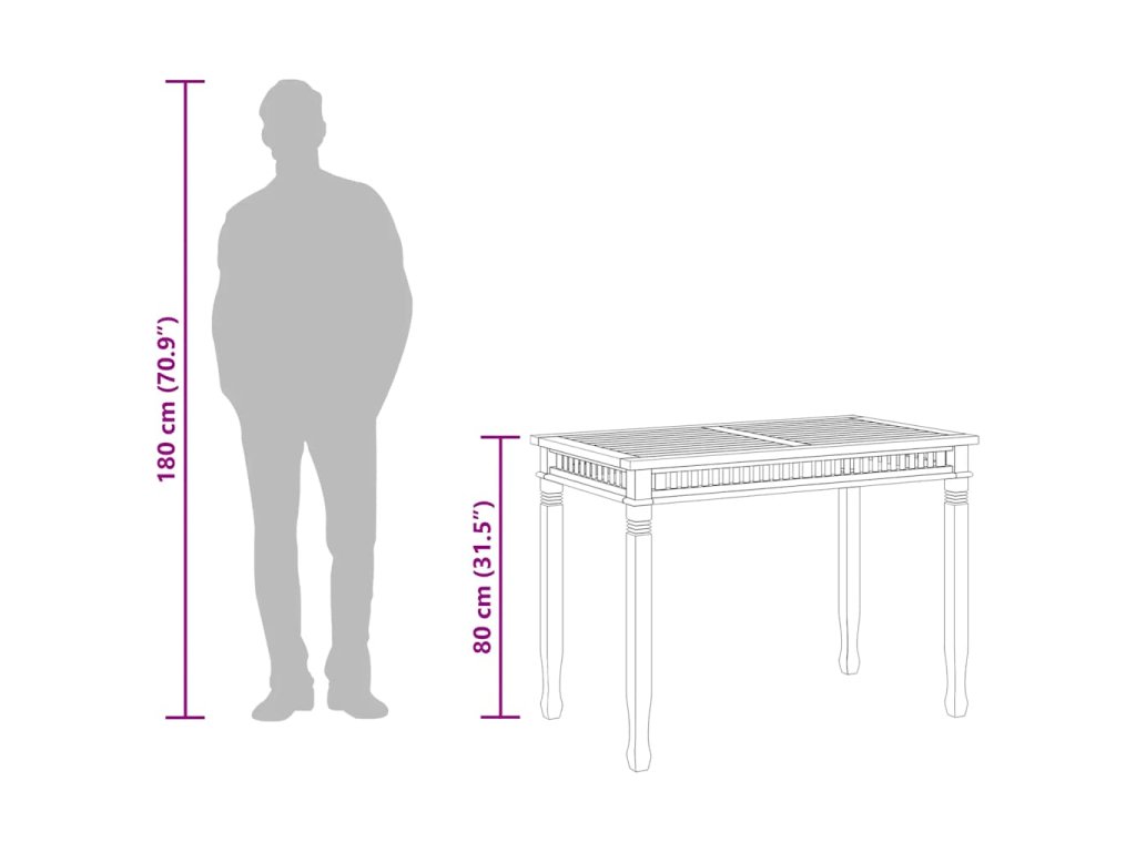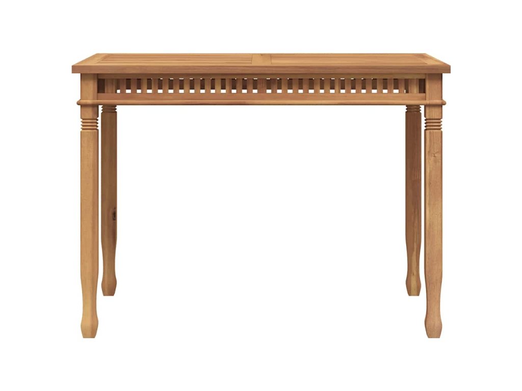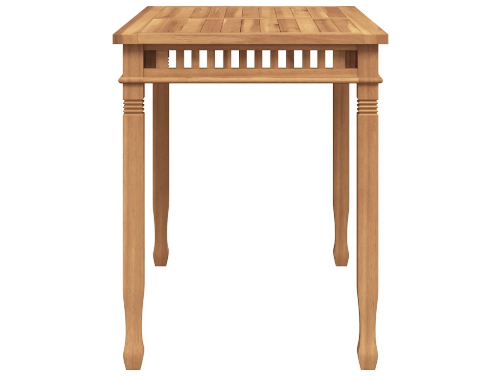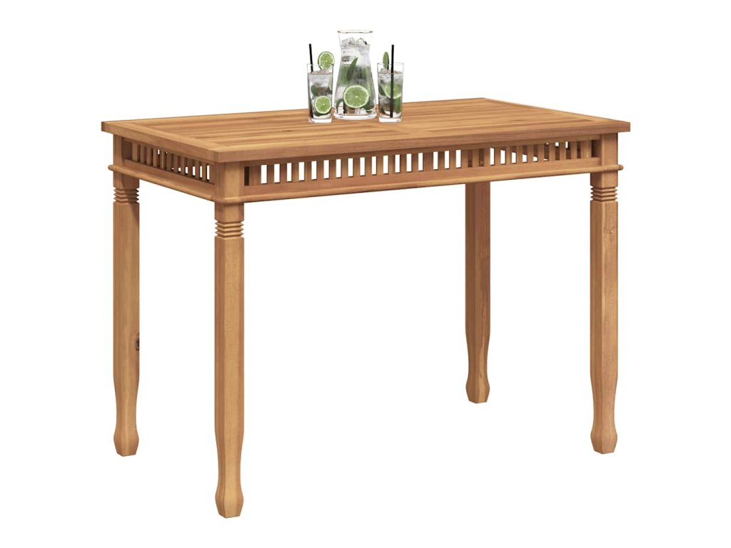 Tento kus tíkového nábytku je vyhotovený z mimoriadne trvácneho tvrdého tíkového dreva, ktoré bolo odležané, umelo vysušené v sušiarni a jeho povrch bol následne jemne obrúsený, aby získal hladký vzhľad. Tíkové drevo sa vyznačuje výnimočnou pevnosťou a odolnosťou voči poveternostným vplyvom. Preto je skvelou voľbou, ak si chcete kúpiť trvácny jedálenský stôl. Pre väčšiu eleganciu je navrhnutý s dizajnom vertikálneho roštu. Ľahko sa čistí a udržuje.