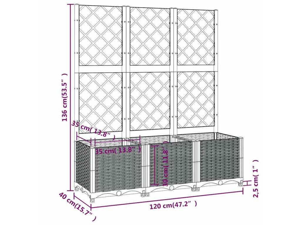 Tento kvetináč je vyrobený z PP odolného voči poveternostným vplyvom, je pevný a vhodný na vonkajšie použitie. Do spodného boxu sa zmestí veľké množstvo zelených rastlín a kvetov. Integrovaná mriežka ponúka skvelú podporu pre pestovanie popínavých rastlín, ako sú paradajky, hrach a ruže.