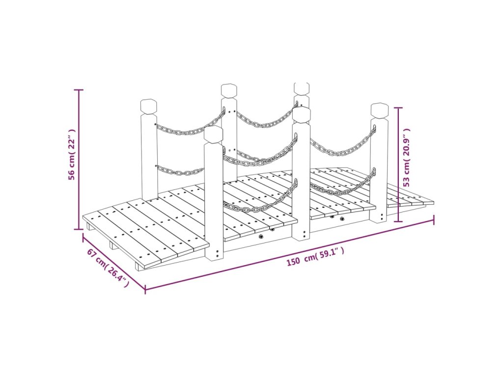 - Drevený rám: Drevený rám záhradného mostíka zaisťuje pevnosť a stabilitu. Dodatočné drevené dosky na spodnej strane ho udržujú stabilnejší bez otrasov.