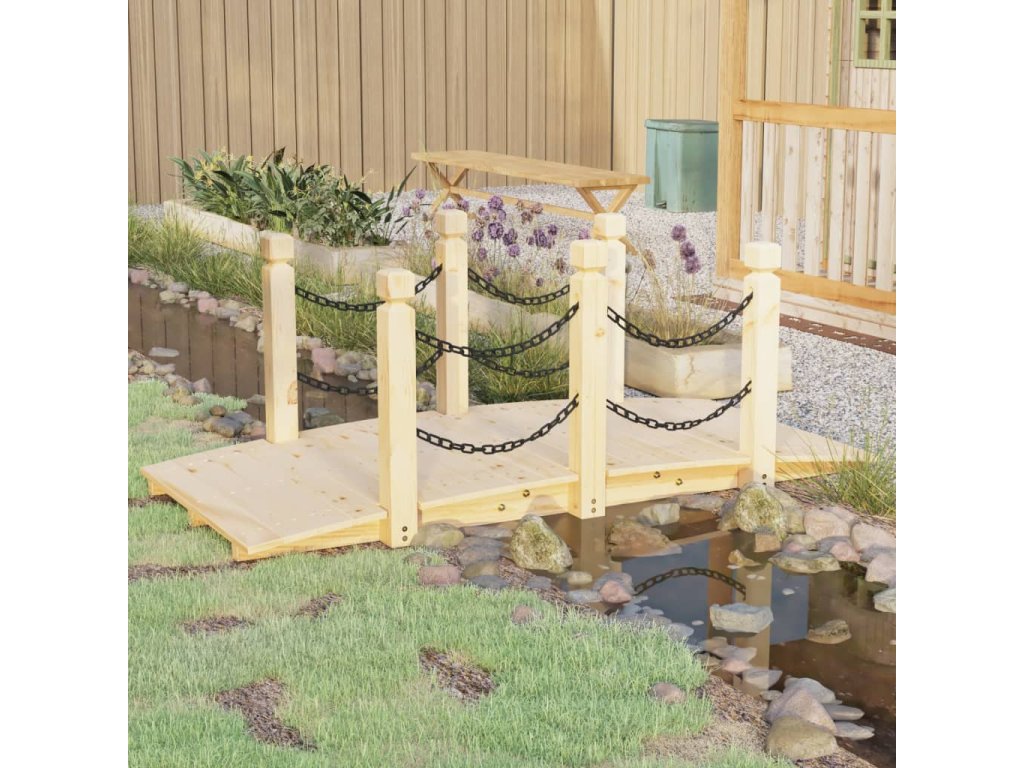 - Drevený rám: Drevený rám záhradného mostíka zaisťuje pevnosť a stabilitu. Dodatočné drevené dosky na spodnej strane ho udržujú stabilnejší bez otrasov.