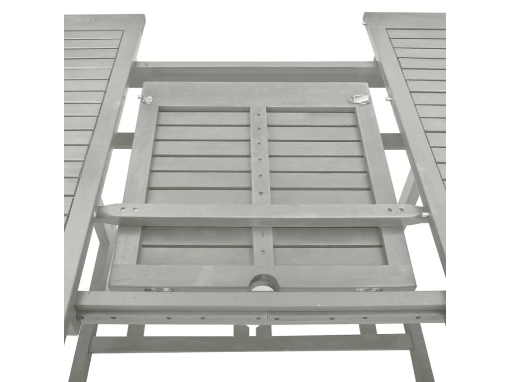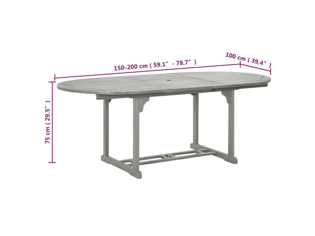Jedálenský stôl je vyrobený z akáciového masívu, tropického tvrdého dreva, ktoré je trvácne a odolné voči poveternostným vplyvom. Stôl sa dá roztiahnuť zo 150 na 200 cm. Stôl je potrebné zmontovať.