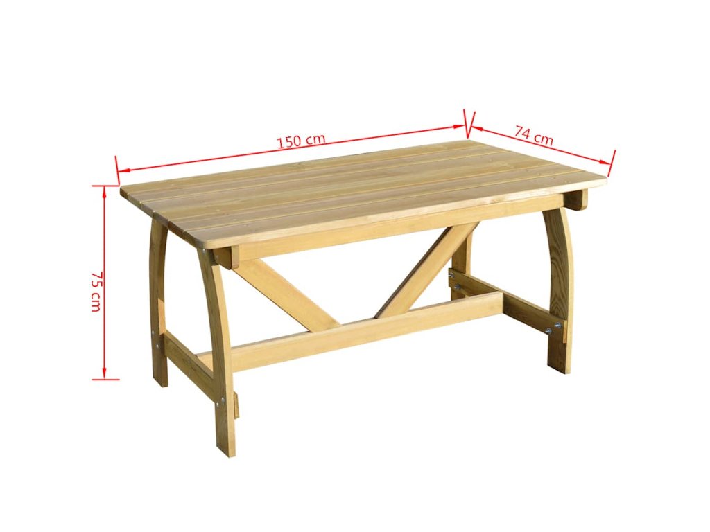Drevený záhradný stôl je vyrobený z borovicového dreva so zelenou impregnáciou, vďaka čomu je veľmi pevný, trvácny a odolný voči hnilobe.