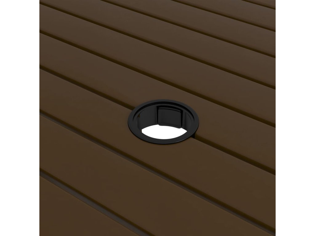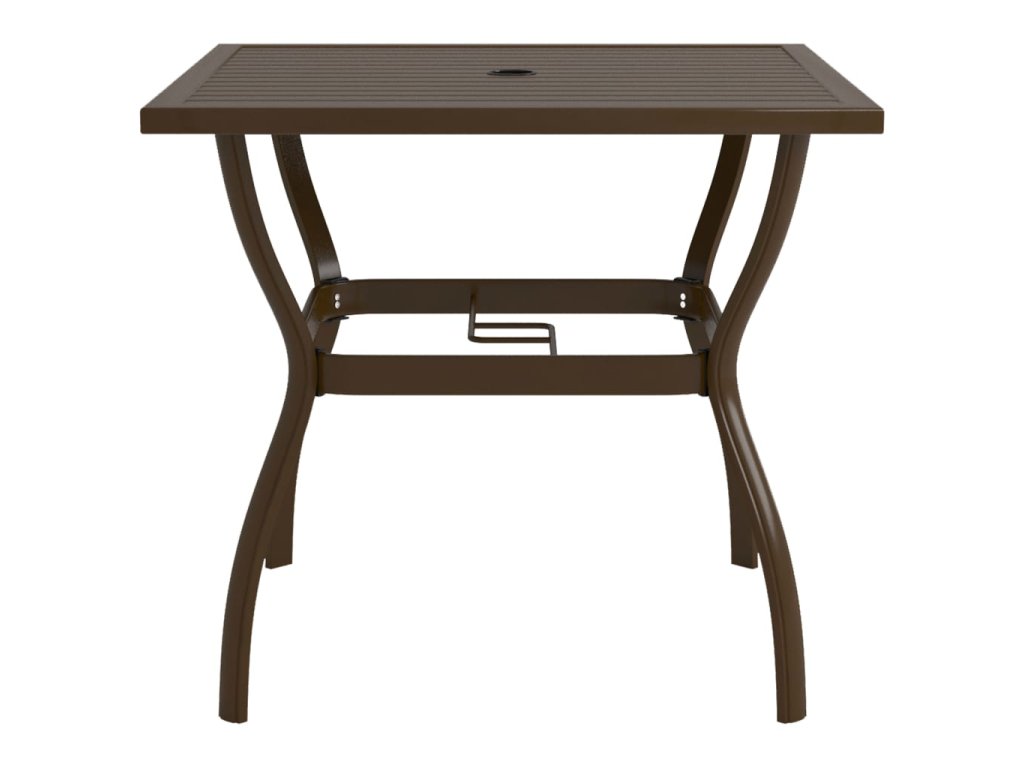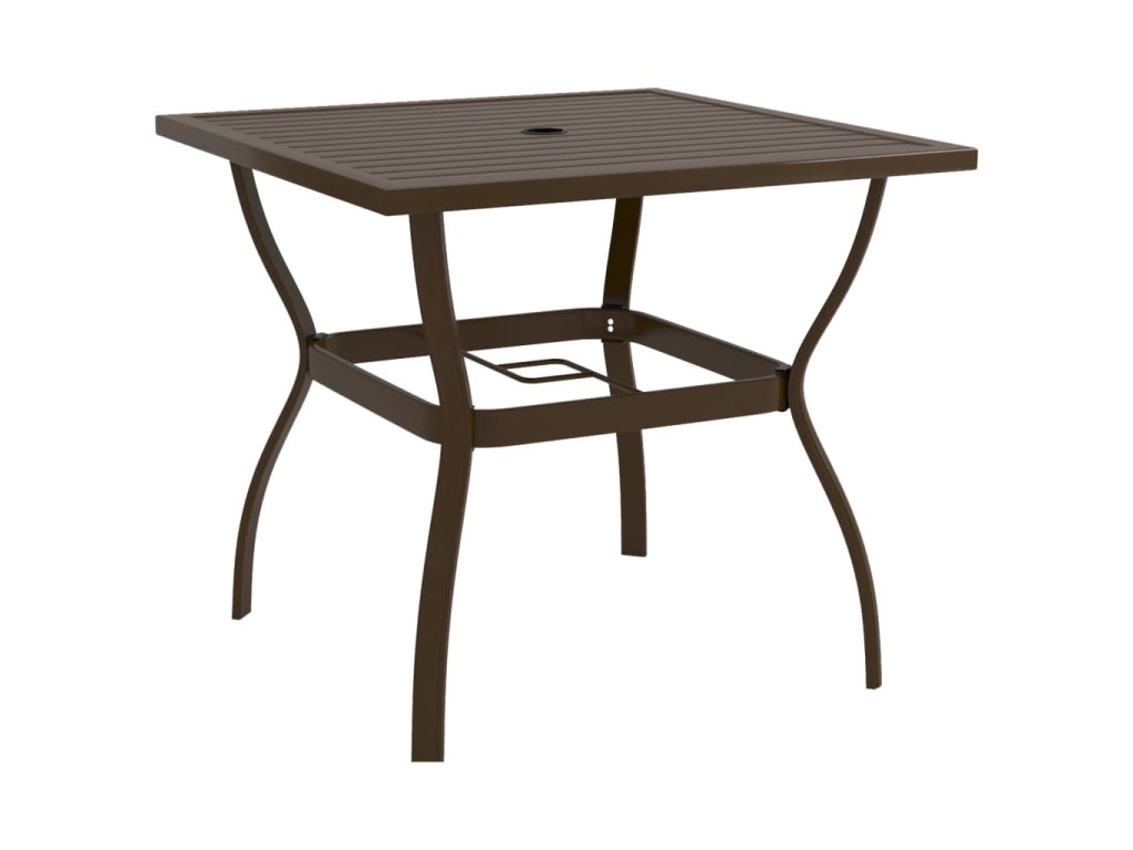 Tento vonkajší stôl je vyrobený z ocele s práškovaným povrchom, vďaka čomu je robustný a stabilný. Stolová doska má navyše v strede otvor na uchytenie slnečníka.