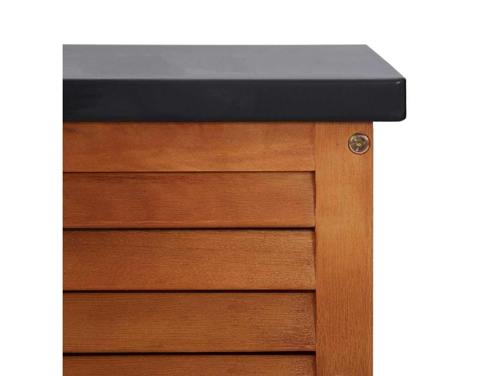 Kovová doska s čiernou práškovou povrchovou úpravou a eukalyptový masív s prírodným olejovým náterom pomáhajú chrániť predmety pred poškodením spôsobeným vlhkosťou. Tento úložný box sa ľahko čistí a udržiava, je odolný a vhodný na každodenné používanie.