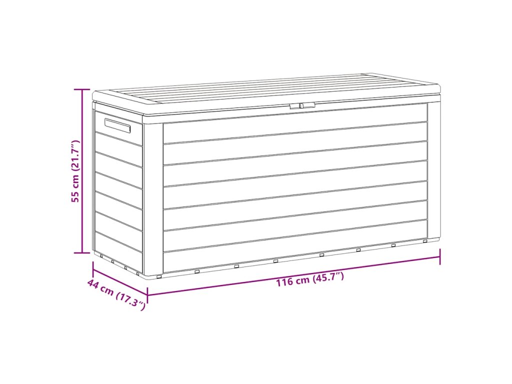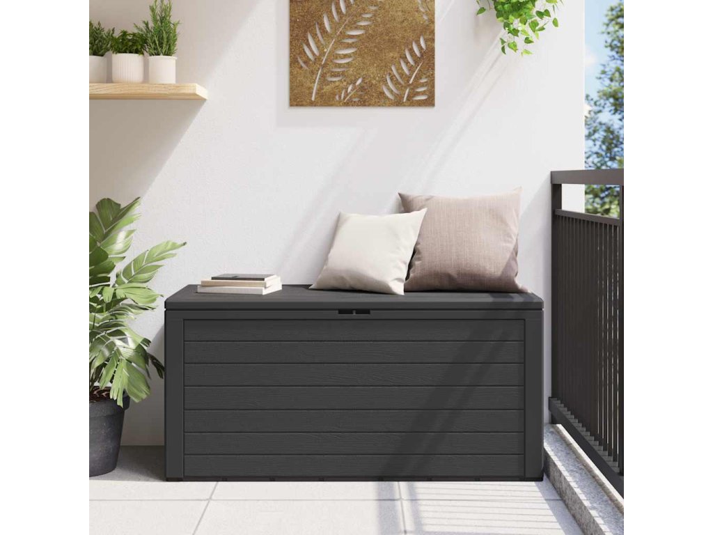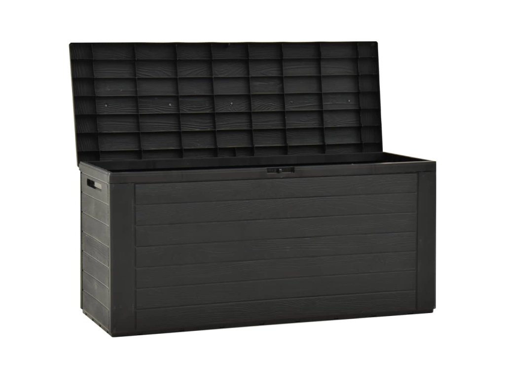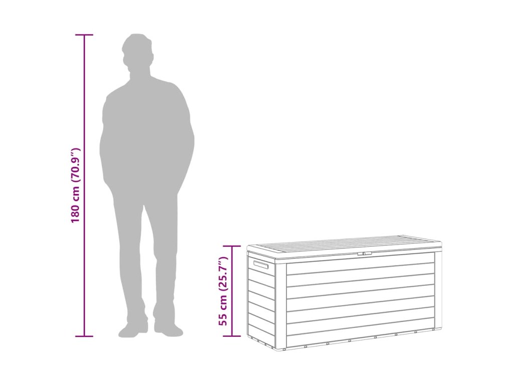 Tento štýlový úložný box je ideálnym riešením na upratanie vašej záhrady, terasy alebo dvora. Priestranný záhradný box je ideálny na uskladnenie vankúšov, podušiek, prikrývok, hračiek a iných predmetov. Vďaka svojej pevnej konštrukcii môže byť použitý aj ako priestor na uskladnenie náradia.