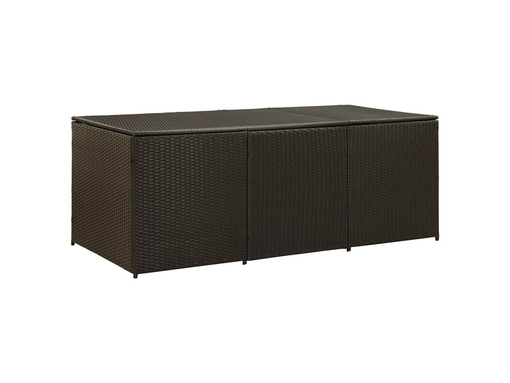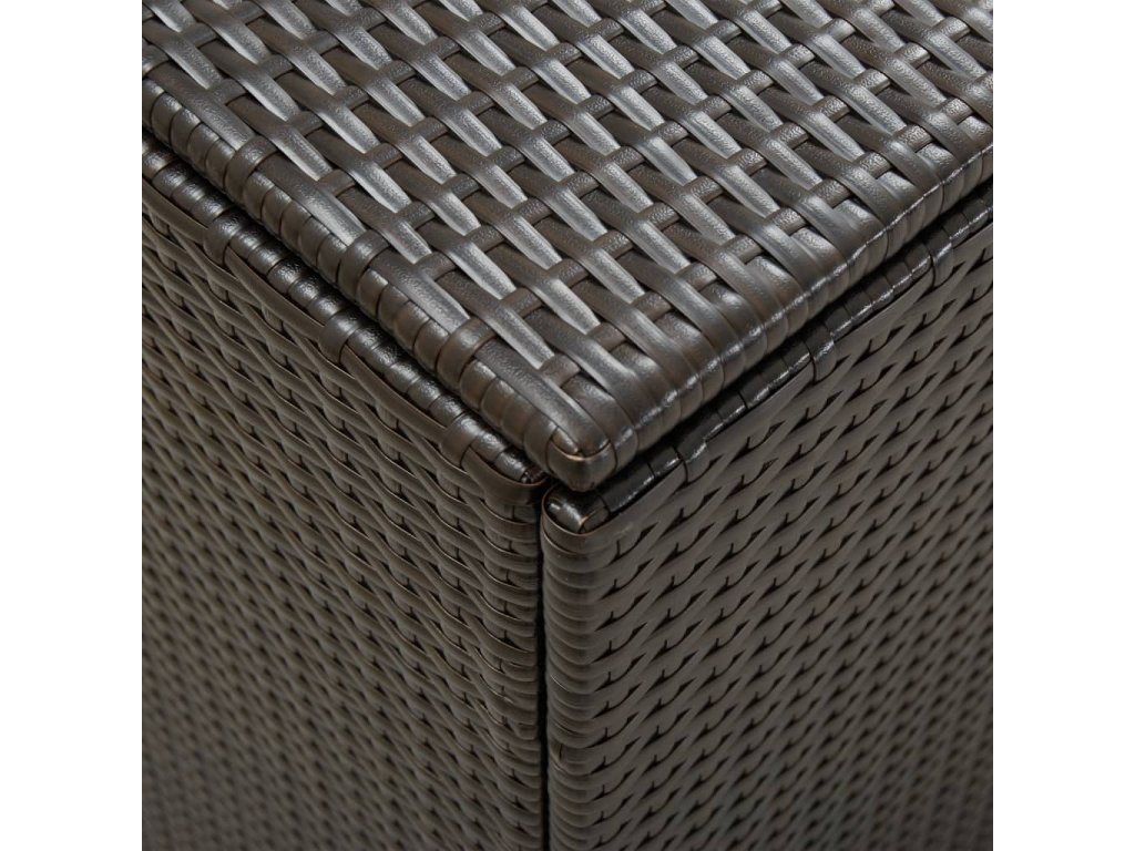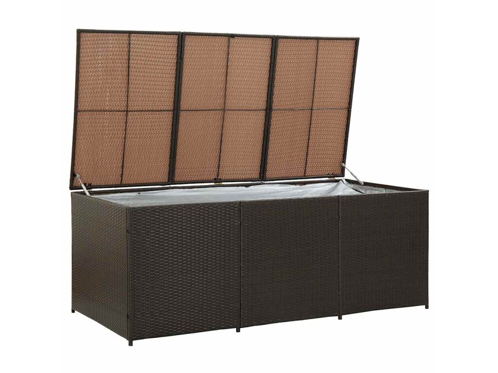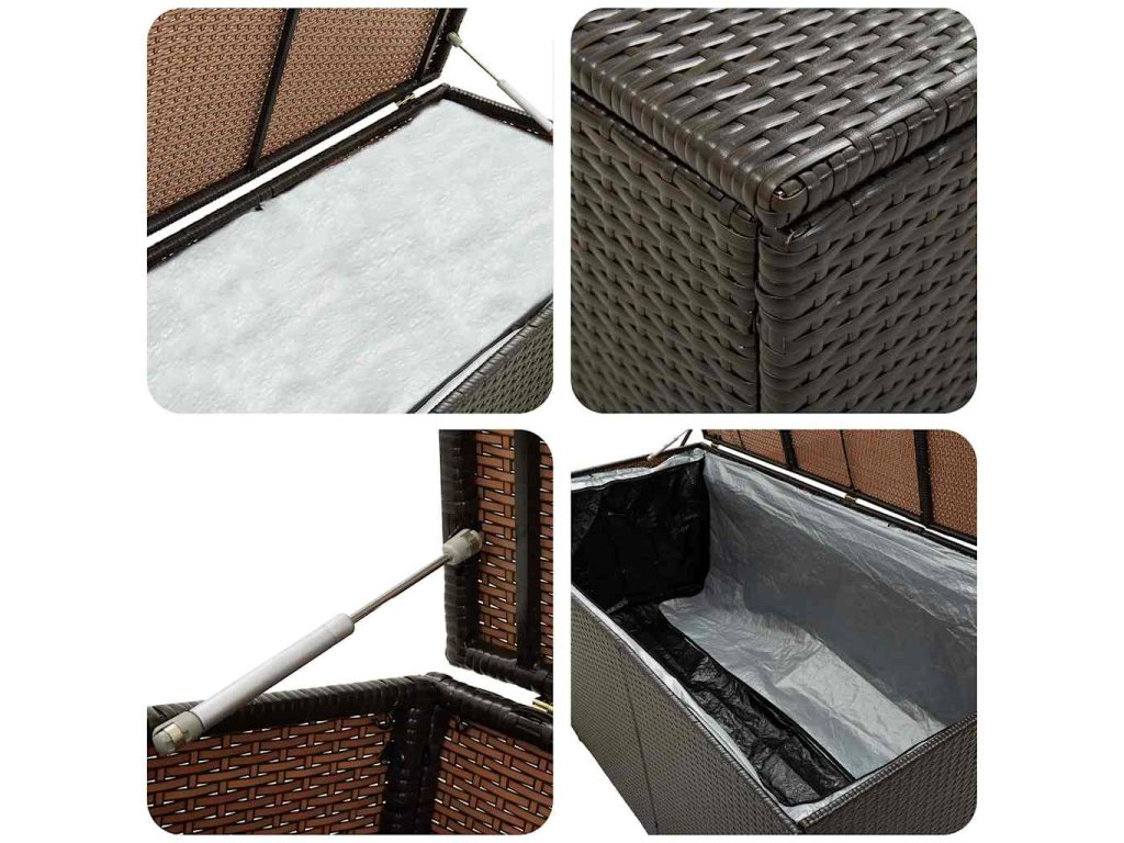 Vďaka priestrannej truhlici poskytuje box dostatok priestoru na odkladanie záhradných potrieb, ako sú podložky na nábytok, vankúše, deky a záhradné náradie. Tento úložný box je vyhotovený z oceľového rámu s práškovou povrchovou úpravou a ručne pleteného polyratanu, vďaka čomu je trvácny, nepodlieha hrdzi a je odolný voči poveternostným vplyvom, a tak vám bude spoľahlivo slúžiť dlhé roky. Obsahuje výstelku, ktorá ochráni obsah boxu pred prachom a vlhkosťou. Vyvýšené nožičky zabezpečujú dostatočné prúdenie vzduchu pod úložným boxom, aby odložené veci zostali suché a čisté. Box je navyše vybavený mechanizmom plynového piesta, aby ste mohli horné veko otvárať a zatvárať bez väčšej námahy. Navyše sa dá ľahko očistiť navlhčenou handričkou.