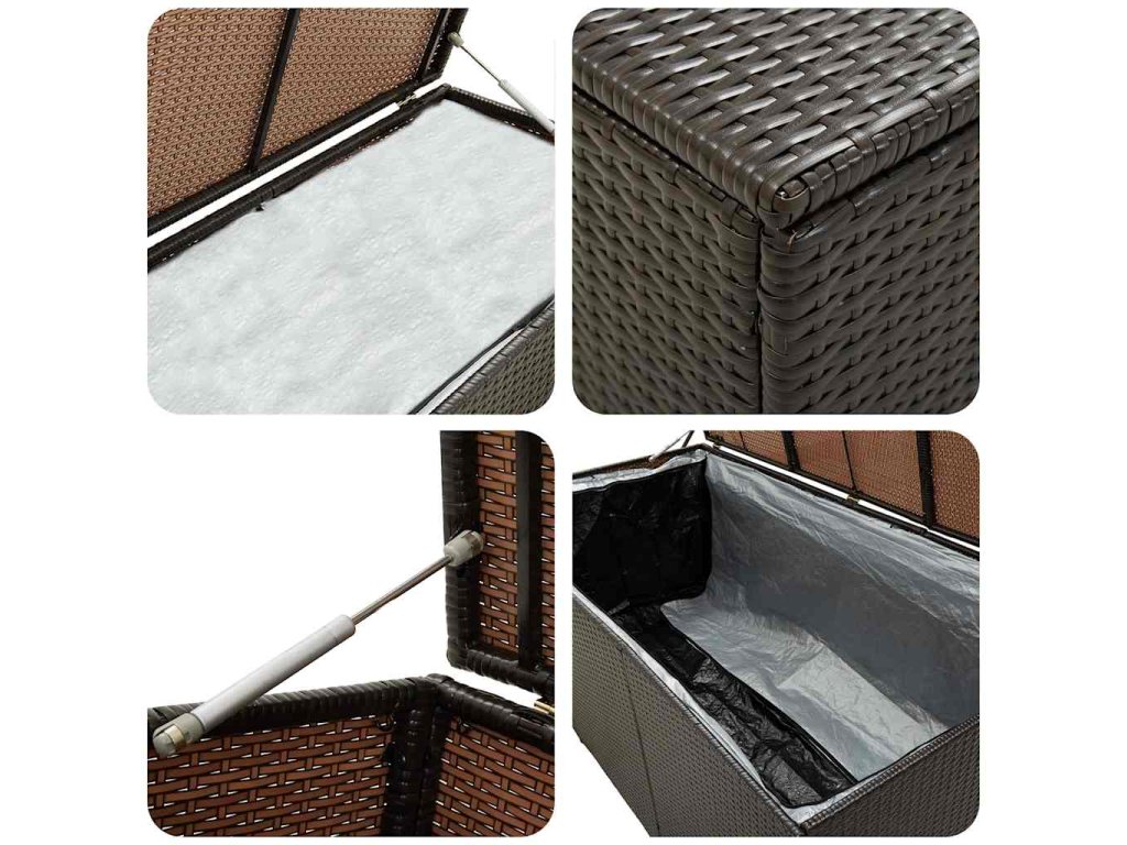 - Dostatok úložného priestoru: Vďaka priestrannej truhlici poskytuje box dostatok priestoru na odkladanie záhradných potrieb, ako sú podložky na nábytok, vankúše, deky a záhradné náradie.