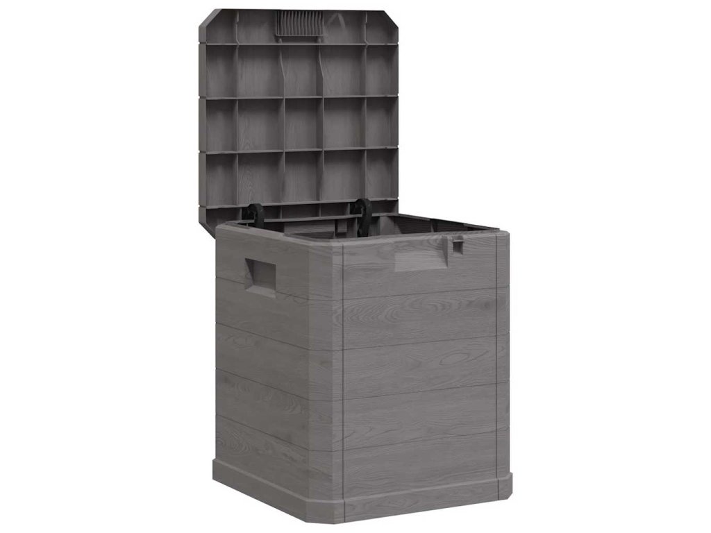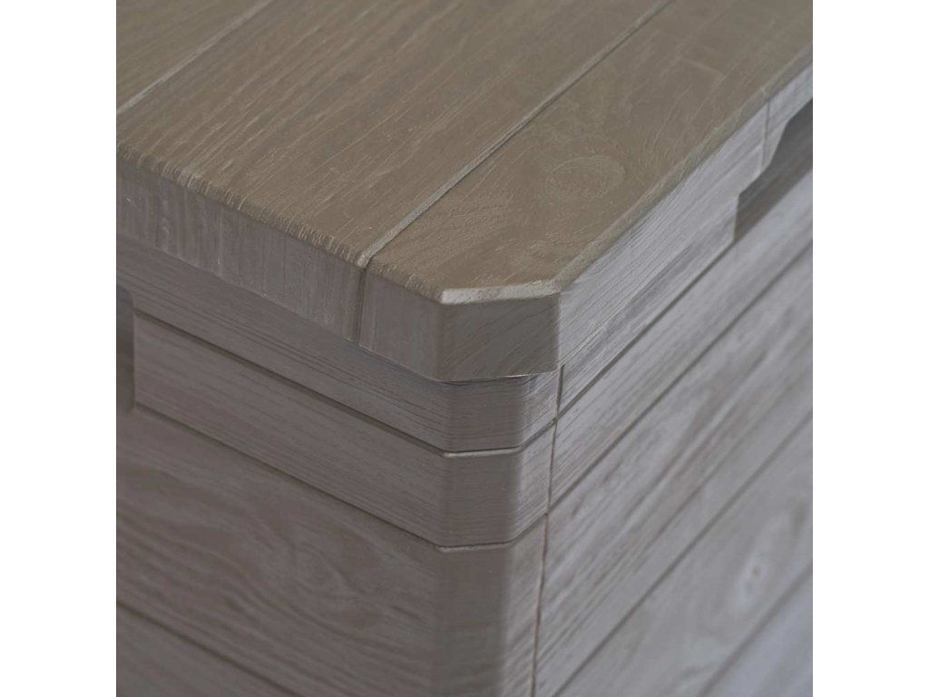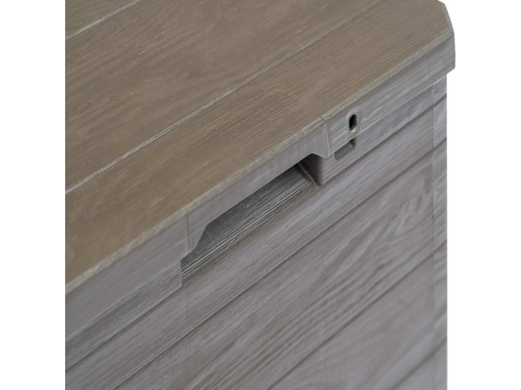 - Štýlový dizajn: Dizajn s drevenou textúrou dodáva záhradnému úložnému boxu nenápadný, no zároveň nadčasový vzhľad, ktorý sa bude pekne hodiť do každého zariadenia.