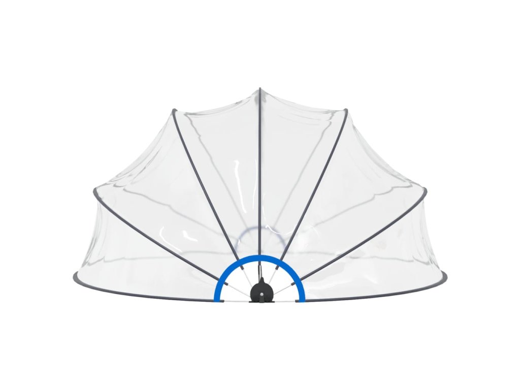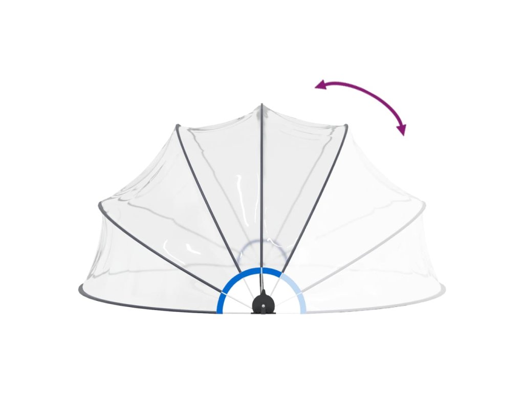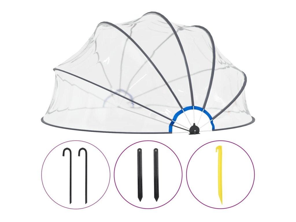 Kryt na bazén je vyrobený z PVC s UPF 30 a má konštrukciu zo sklolaminátu. Poskytne vám vynikajúcu ochranu pred slnkom a dažďom. Postará sa o to, aby sa do bazéna nedostalo lístie, hmyz, prach a ďalšie nečistoty z vonka. V prípade potreby dokáže zabezpečiť rýchlejší ohrev vody a menší únik tepla v priebehu noci. Prístrešok sa ľahko otvára vďaka jedinečnému mechanizmu s pántmi. Kryt je priehľadný, a tak vám neunikne žiadne dianie okolo bazéna. Zastrešenie bazénu sa dodáva spolu s hrotmi a hákovými klincami do zeme, pomocou ktorých ho môžete pevne ukotviť k zemi. A tak sa nemusíte obávať, že vietor toto zastrešenie bazénu odfúkne.