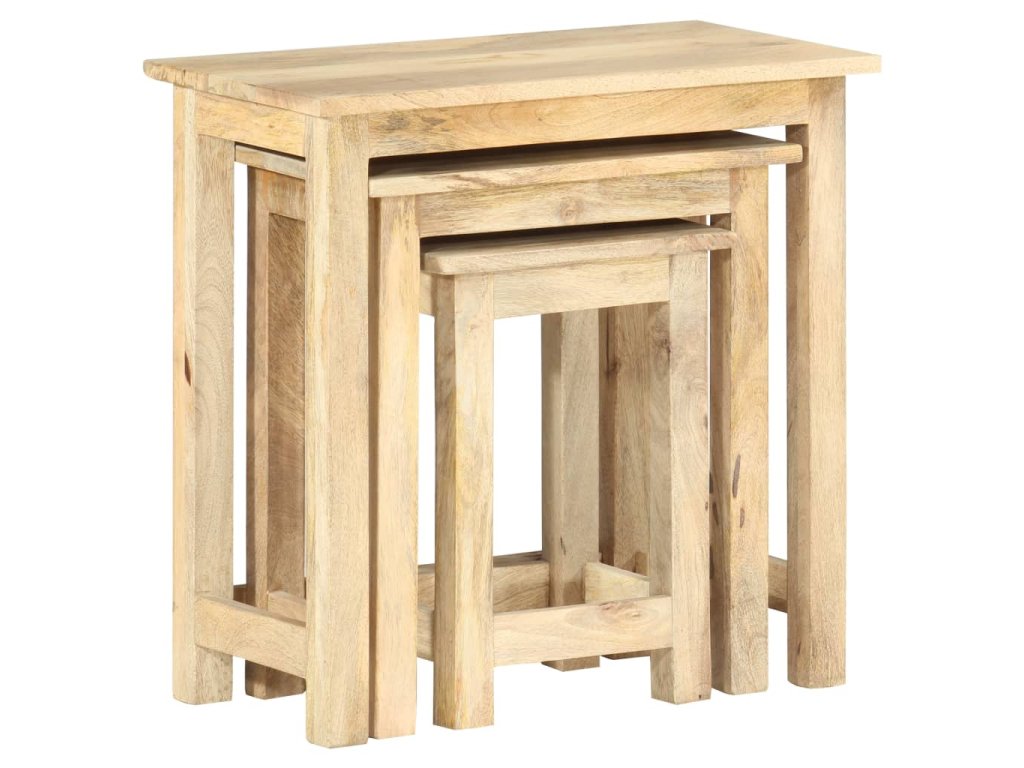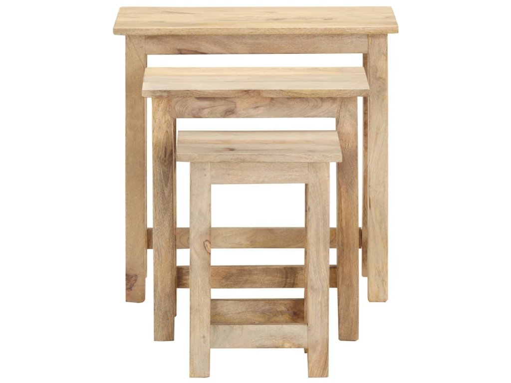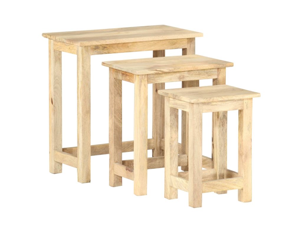 Táto súprava 3 zasúvacích stolíkov je vyrobená z prvotriedneho mangového dreva, čo zaručuje, že každý kus nábytku je pevný, stabilný a odolný. Vďaka kresbe dreva sú jedinečné a každý kus je mierne odlišný od ostatných. Mangové drevo je hrubé a pevné tvrdé drevo, ktoré má na povrchu krásne hnedé alebo zlaté pruhy a kontúry. Každý proces rezania, leštenia a natierania je dôkladne vyhotovený.