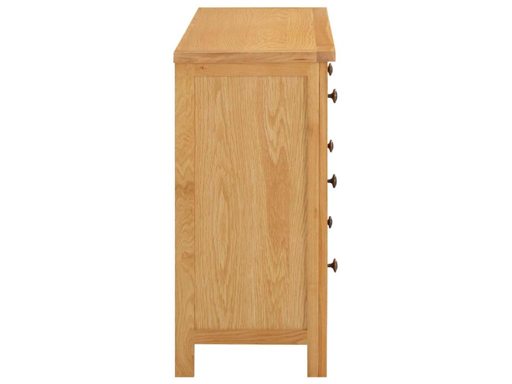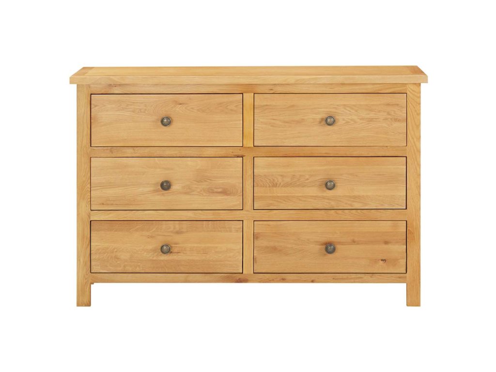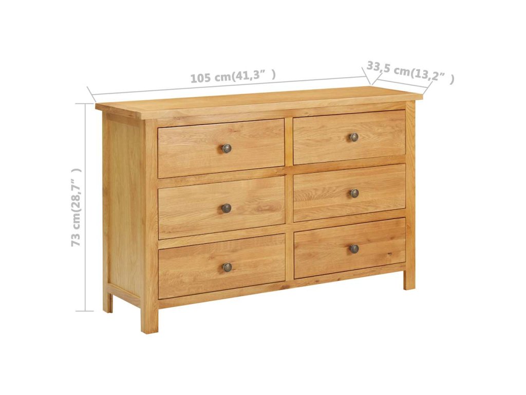 Táto skrinka je vyrobená z masívneho dubového dreva s prírodnou povrchovou úpravou. Na predĺženie životnosti ju preto odporúčame ošetriť dubovým olejom alebo povrchovou úpravou na vodnej báze. Skrinka so zásuvkami má stabilnú hornú časť na umiestnenie kníh, váz, dekoratívnych predmetov, atď. Obsahuje aj šesť zásuviek, ktoré poskytujú dostatočný priestor na uloženie vášho oblečenia a malých predmetov.