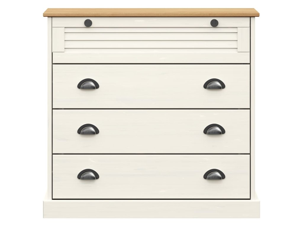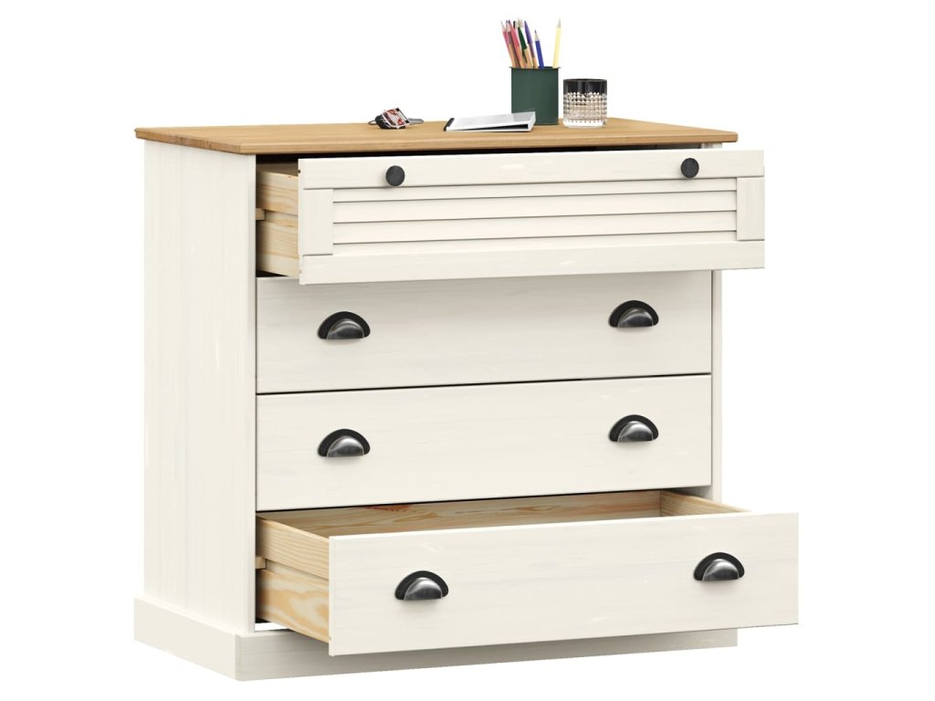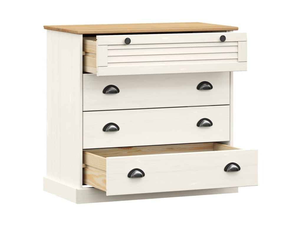 - Borovicový masív: Borovicový masív je krásny prírodný materiál. Borovicové drevo má rovnú kresbu a nachádzajú sa na ňom hrče, ktoré tomuto materiálu dodávajú charakteristický rustikálny vzhľad. Zásuvková skrinka je vyrobená z masívneho borovicového dreva a je odolná a pevná.