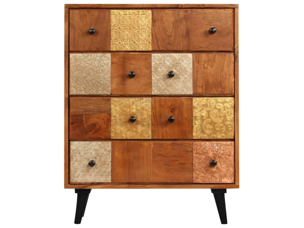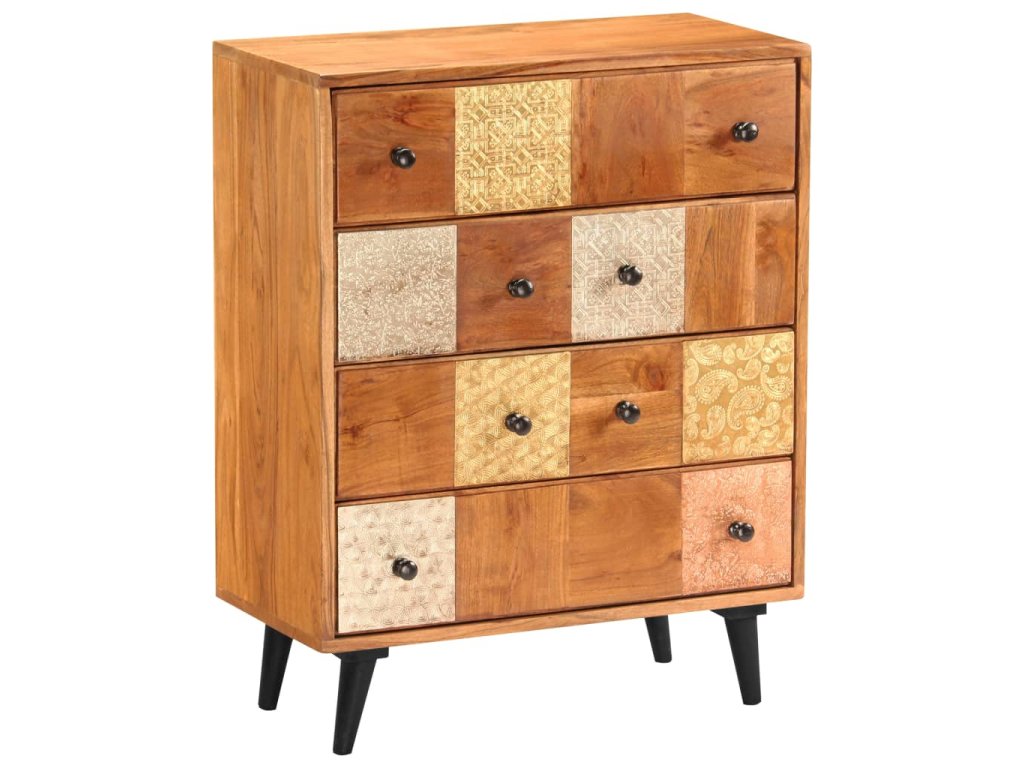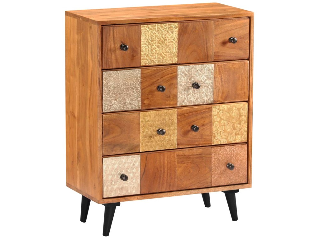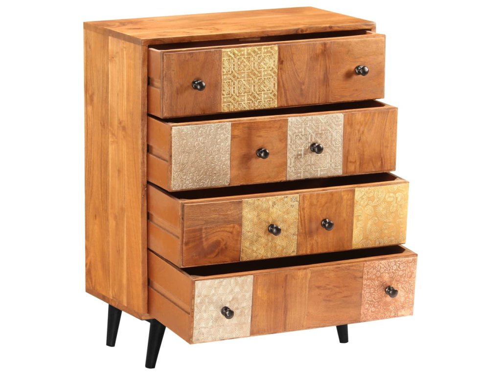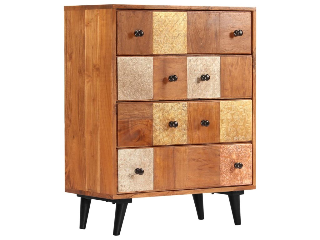 Táto zásuvková skrinka je vyrobená z masívneho akáciového dreva s jemnou medovou povrchovou úpravou, ktorá jej dodáva krásny vzhľad a teplé farby. Nádherné ozdobné kovové detaily v rôznych farebných odtieňoch, ale aj rúčky v starožitnom štýle dodávajú skrinke luxusný nádych. Vďaka remeselnému spracovaniu a krásnej drevenej štruktúre je každý kus nábytku jedinečný a mierne odlišný od ďalšieho kusu. Táto skrinka je vybavená 4 zásuvkami, ktoré poskytujú dostatok priestoru na uloženie vášho oblečenia, kníh a rôznych ďalších predmetov.