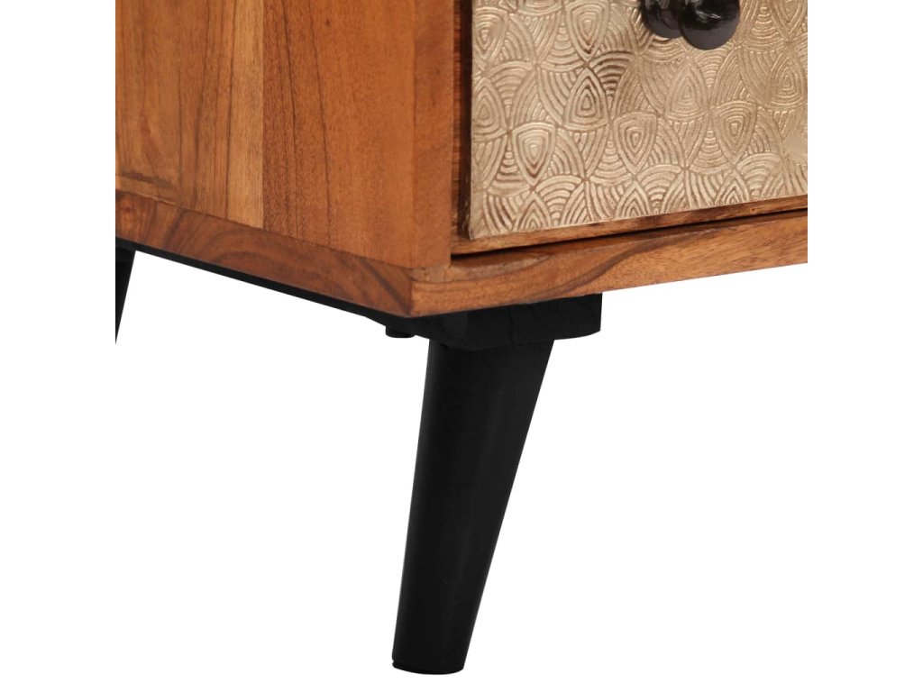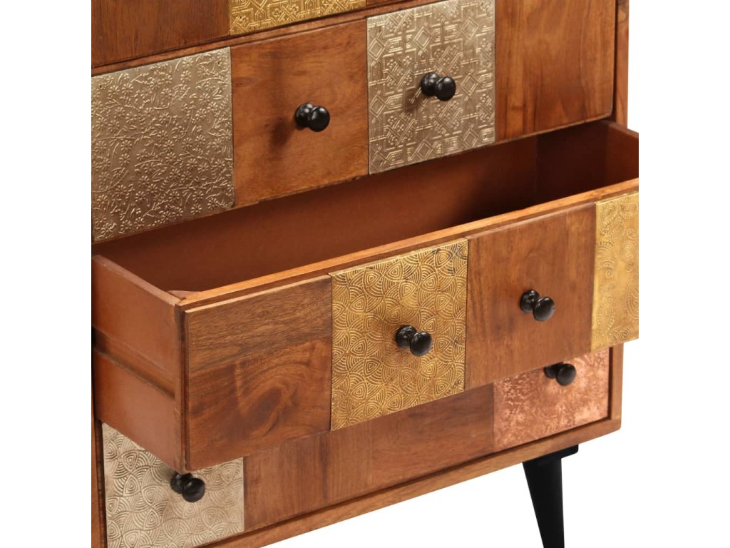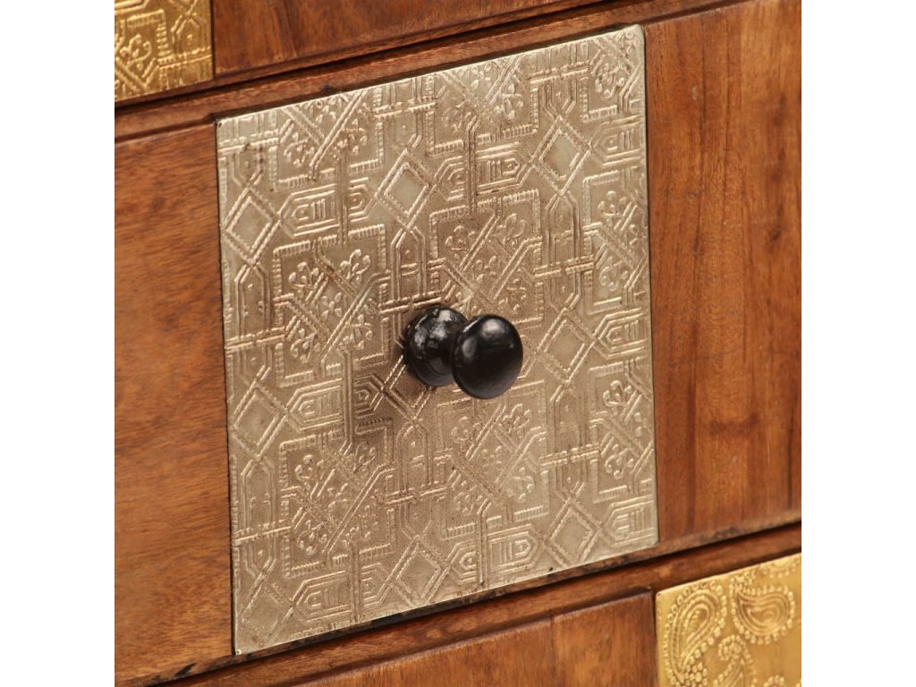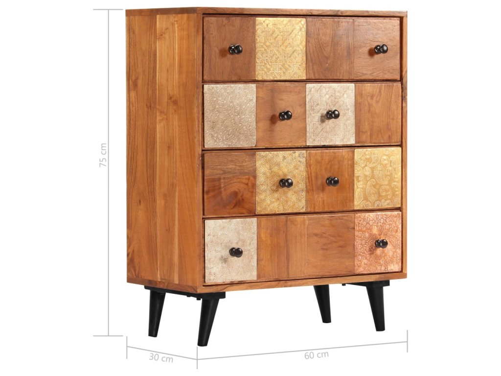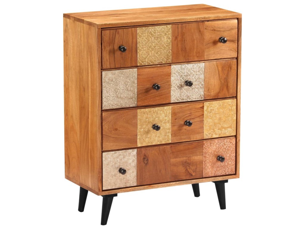 Táto zásuvková skrinka je vyrobená z masívneho akáciového dreva s jemnou medovou povrchovou úpravou, ktorá jej dodáva krásny vzhľad a teplé farby. Nádherné ozdobné kovové detaily v rôznych farebných odtieňoch, ale aj rúčky v starožitnom štýle dodávajú skrinke luxusný nádych. Vďaka remeselnému spracovaniu a krásnej drevenej štruktúre je každý kus nábytku jedinečný a mierne odlišný od ďalšieho kusu. Táto skrinka je vybavená 4 zásuvkami, ktoré poskytujú dostatok priestoru na uloženie vášho oblečenia, kníh a rôznych ďalších predmetov.