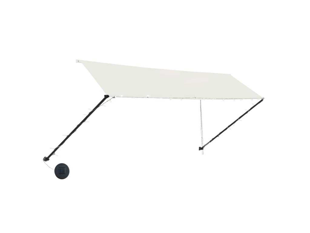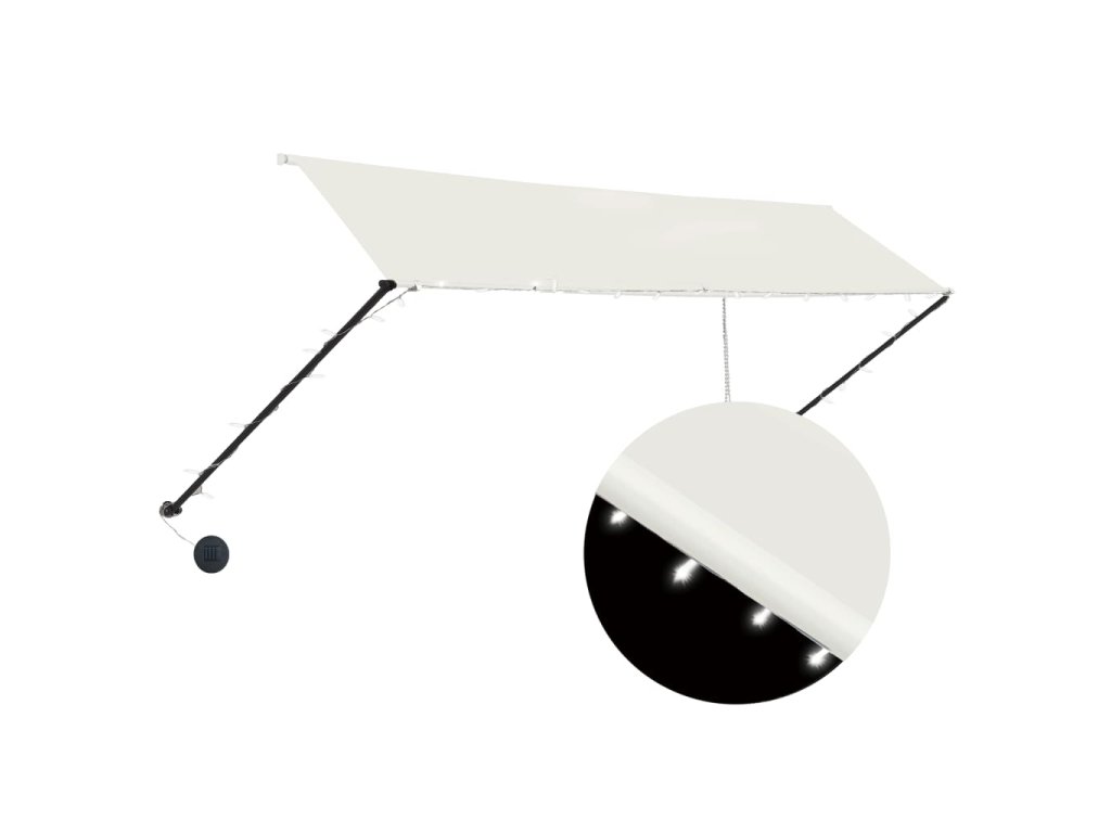 Táto markíza je vodeodolná a odolná voči UV žiareniu a poveternostným vplyvom, pretože je vyrobená z vysokokvalitnej tkaniny s PA povlakom. Odolný oceľový rám zabezpečuje, že je markíza pevná a trvácna. Ľahko čistiteľná polyesterová strieška sa dá odstrániť a očistiť. Tento výrobok môžete v prípade potreby používať nielen ako obyčajnú markízu, ale aj ako kompletný kryt na okno. Vďaka podpornej tyči a reťazi sa dá táto markíza zatiahnuť. Okrem toho sa dá nastaviť jej výška a uhol na lepšie zatienenie. Solárne napájané LED svetlá poskytujú úsporné osvetlenie v noci.