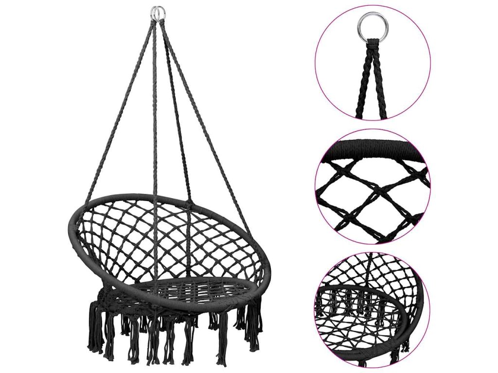 Táto hojdačka na strom má oceľový rám a oderu-vzdornú lanovú sieť, vďaka čomu je pevná a má vysokú nosnosť. Výšku operadla stoličky môžete prispôsobiť tak, aby vám presne sedela. Môžete tiež nastaviť výšku celej hojdačky tak, aby nohy detí zostali na zemi alebo nad ňou, podľa svojich preferencií. Hojdacia stolička poskytuje väčšiu oporu a stabilitu, takže sa vaše deti nebudú musieť držať lana v strachu z pádu. Môžu tak pohodlne relaxovať a odpočívať v pokoji pri hojdaní. Každé nastaviteľné závesné lano hojdačku pevne spája, zatiaľ čo štyri závesné body poskytujú rovnomerné rozloženie sily pre udržanie rovnováhy a zaistenie bezpečnosti. Navyše, strapcový dizajn ju skrášľuje.