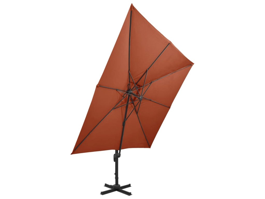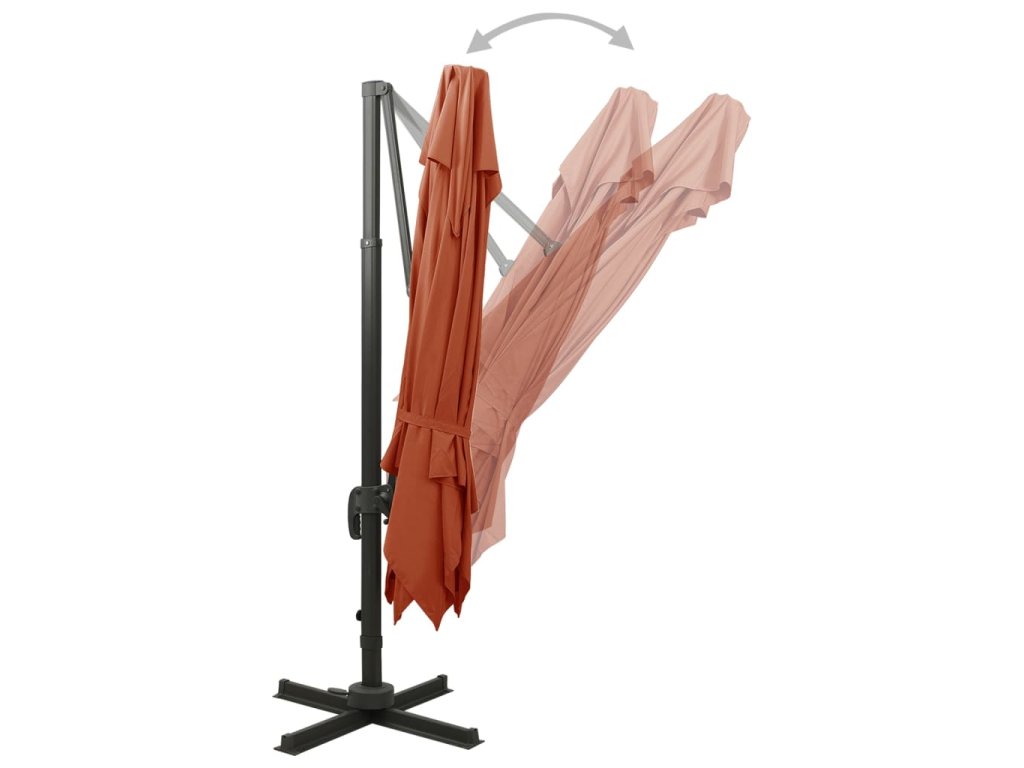Vrch slnečníka vám poskytne optimálnu ochranu pred slnkom a ľahko sa čistí, pretože je vyrobený z polyesteru odolného voči UV žiareniu a vyblednutiu. Má stabilný krížový podstavec, ktorý mu dodáva stabilitu. Exkluzívny dizajn umožňuje slnečník nakloniť a otáčať o 360 stupňov, aby zablokoval zapadajúce slnko. Vďaka pevnej hliníkovej tyči a 8 rebrám je slnečník veľmi stabilný a trvácny. Tento záhradný slnečník sa dá ľahko otvárať a zatvárať vďaka kľukovému mechanizmu. Dvojitý vrchný kryt navyše umožňuje vetranie.