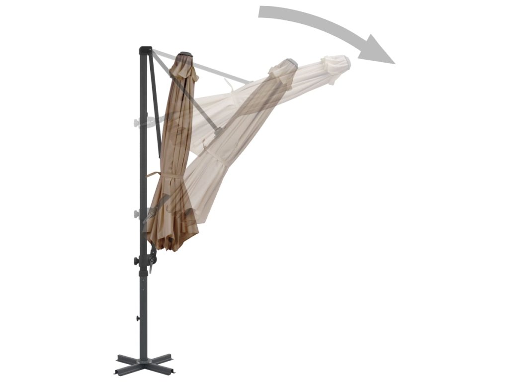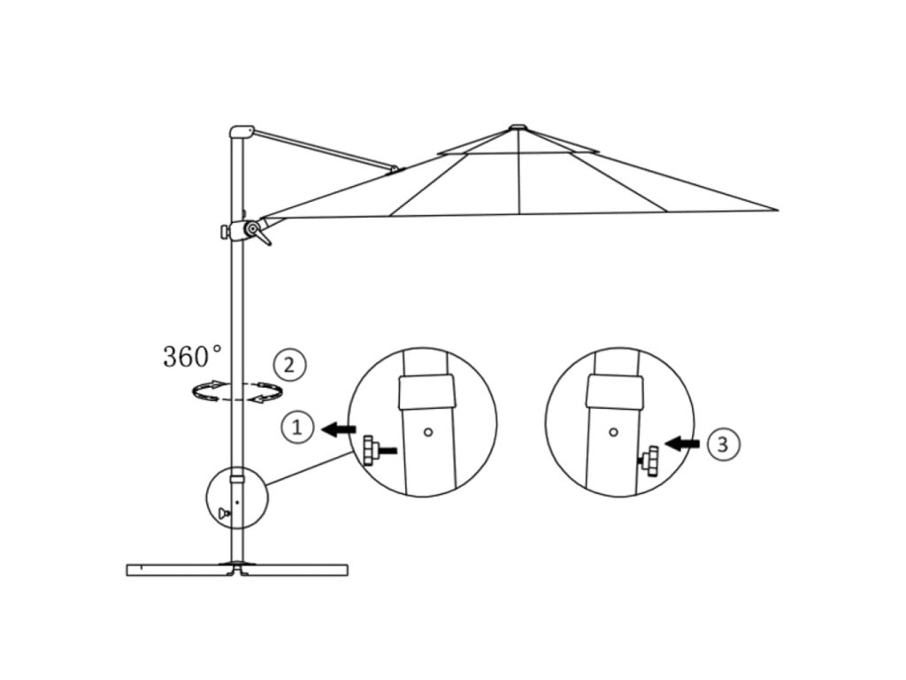 Vrch slnečníka vám poskytne optimálnu ochranu pred slnkom a ľahko sa čistí, pretože je vyrobený z polyesteru odolného voči UV žiareniu a vyblednutiu. Má stabilný krížový podstavec, ktorý mu dodáva stabilitu. Exkluzívny dizajn tohto slnečníka umožňuje nakloniť slnečník a otáčať ho o 360 stupňov, aby zablokoval zapadajúce slnko. Vďaka pevnej hliníkovej tyči a 8 odolným rebrám je slnečník veľmi stabilný a trvácny. Náš záhradný slnečník sa dá ľahko otvárať a zatvárať vďaka kľukovému mechanizmu. Výrobok sa jednoducho montuje.