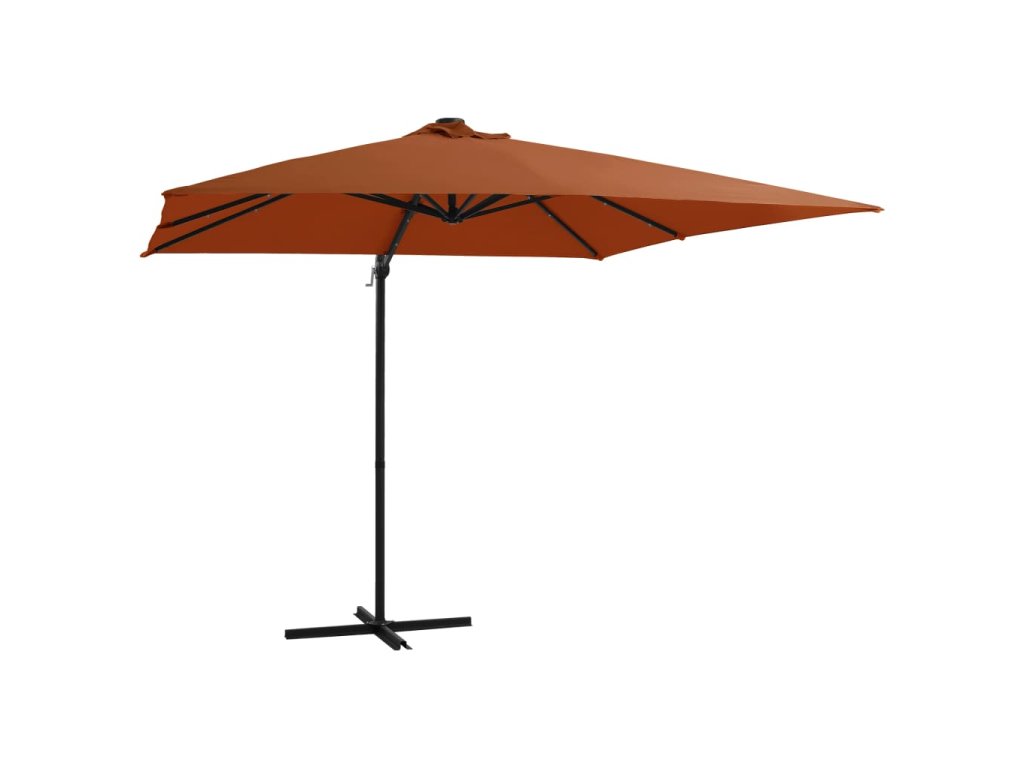 Slnečník je vyrobený z polyesteru, ktorý nevybledne a je odolný voči UV žiareniu, vďaka čomu vám poskytne optimálnu ochranu pred slnkom a ľahko sa čistí. Je vybavený 24 solárnymi LED diódami, ktoré automaticky osvetlia vaše vonkajšie priestory a po zotmení vytvoria vo vašej záhrade príjemnú a romantickú atmosféru. Dodáva sa s pevným podstavcom v tvare kríža pre lepšiu stabilitu. Exkluzívny dizajn vám umožňuje nakloniť a otočiť slnečník o 360 stupňov, aby ste zabránili slnečnému žiareniu. Pevná oceľová tyč spolu s 8 trvácnymi rebrami zabezpečujú výbornú stabilitu a dlhú životnosť. Tento záhradný slnečník sa dá jednoducho otvárať a zatvárať pomocou kľukového mechanizmu.