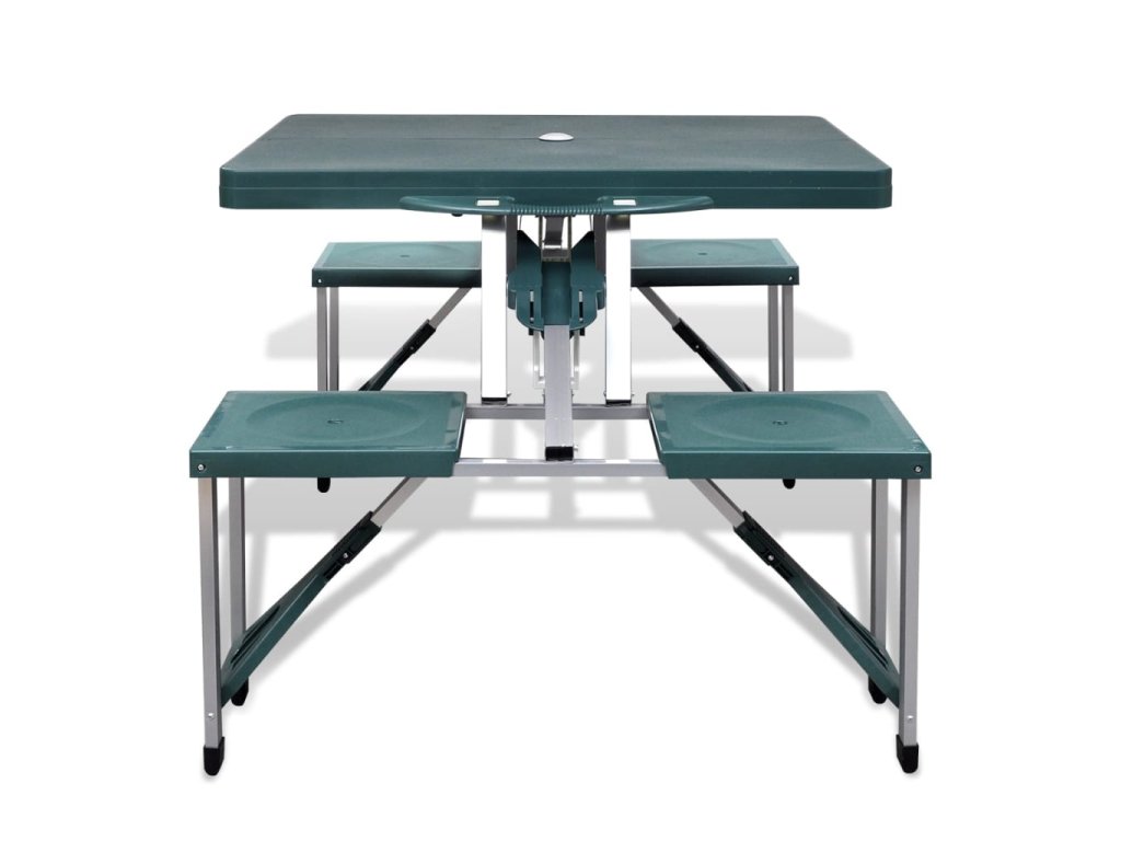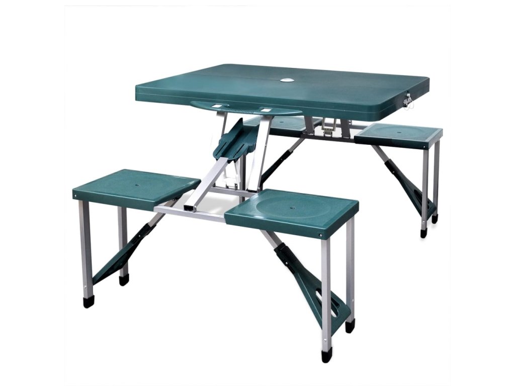 Táto integrovaná súprava kempingových stolov sa skladá z 1 stola a 4 stoličiek. S praktickou rukoväťou na prenášanie a skladacím dizajnom je ideálny na použitie v kuchyniach, na terasách, v záhradách alebo na pikniky a kempingové výlety.