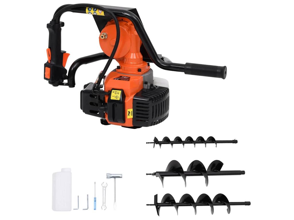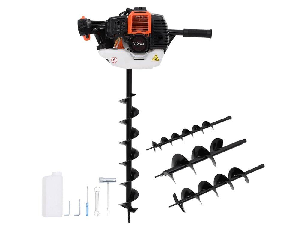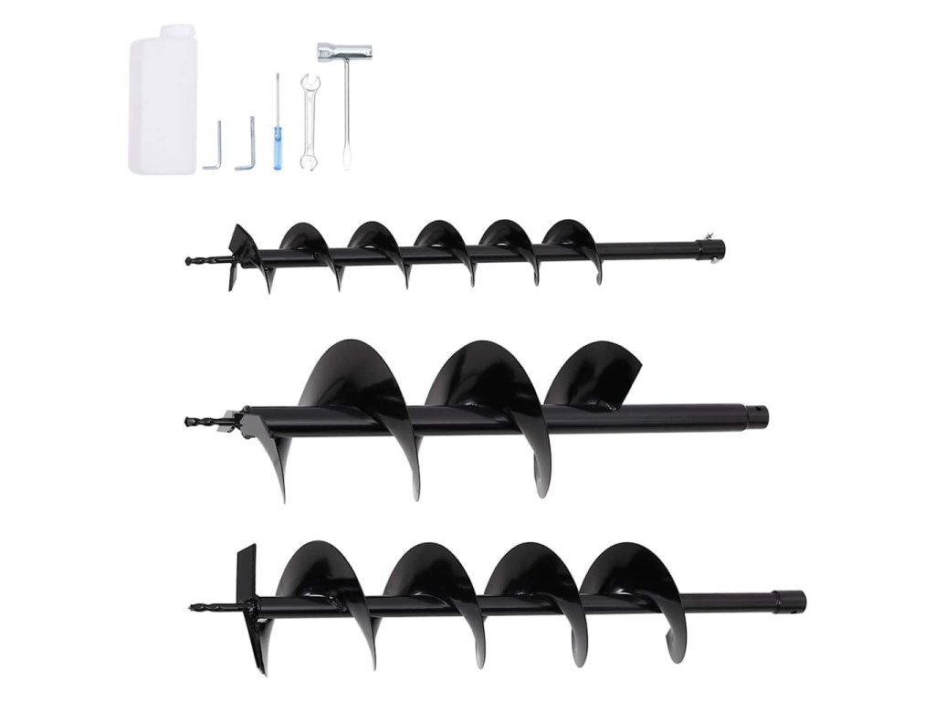 Benzínový zemný vrták sa dodáva spolu s 3 železnými zemnými vrtákmi, 1 miešacou nádobou, 1 vŕtacou súpravou a 1 sadou nástrojov. 3 vrtáky zahrnuté v balení majú rôzne priemery, aby ste si mohli vybrať ten, ktorý bude pre vašu prácu najvhodnejší.