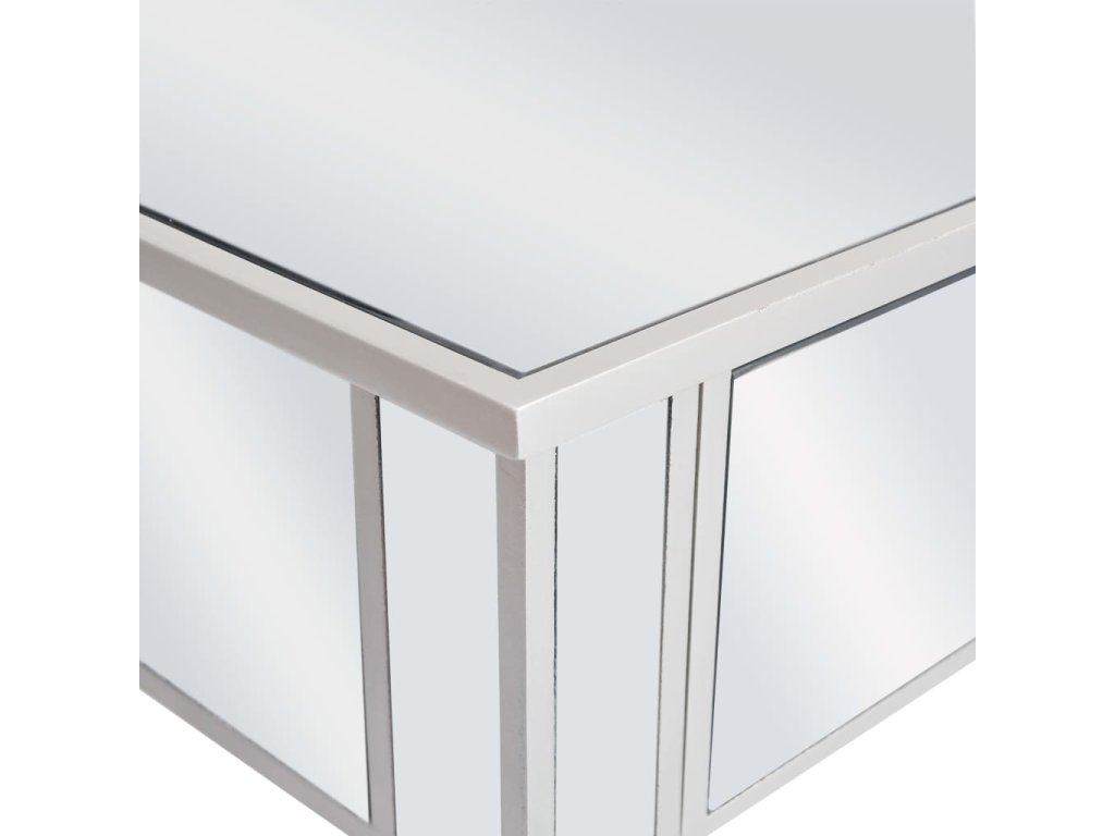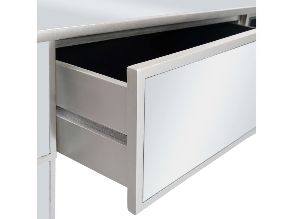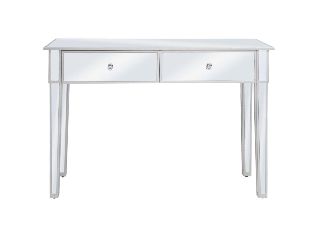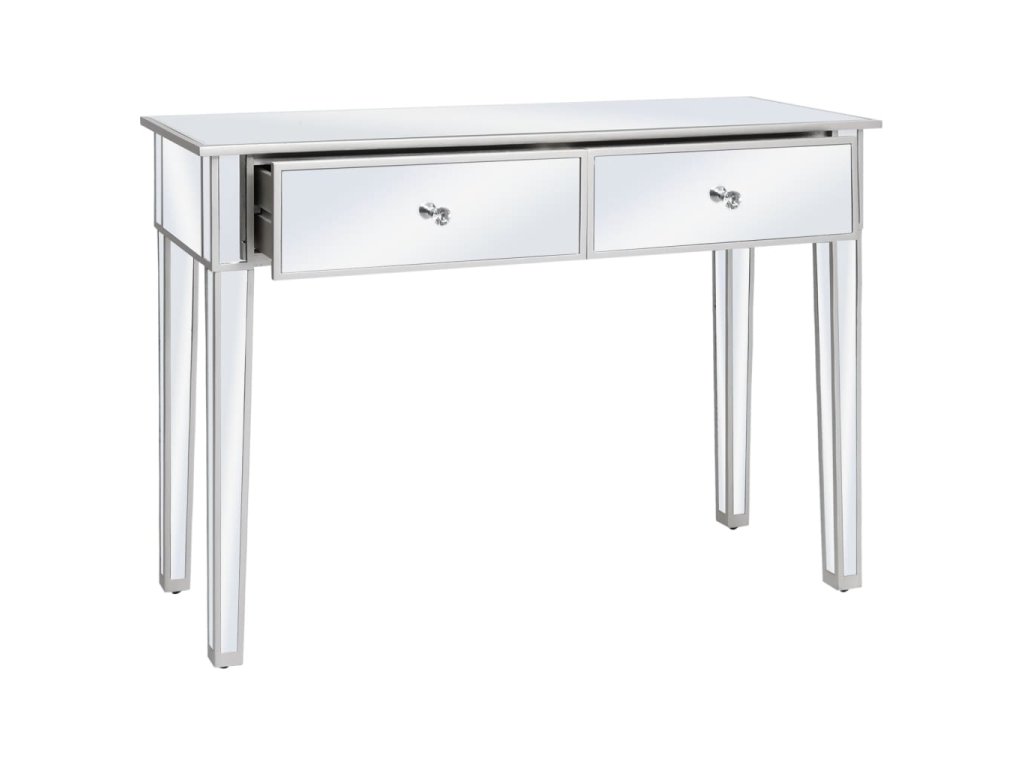 Tento príručný stolík je vyzdobený lesklým zrkadlovým sklom a vyžaruje z neho sofistikovaný šarm. Stôl má MDF rám, vďaka ktorému je pevný a trvácny. Dve zásuvky poskytujú priestor na uloženie a usporiadanie všetkých menších predmetov. Kľučky z umelých kryštálov mu pridávajú elegantný šarm a umožňujú jednoduché otvorenie zásuviek.