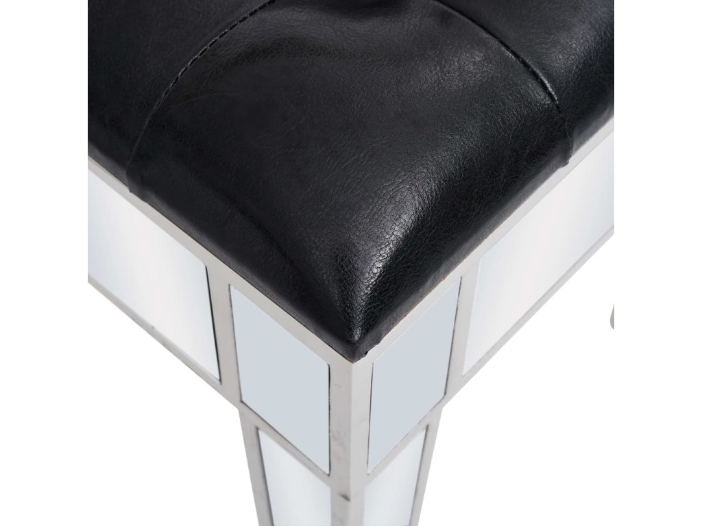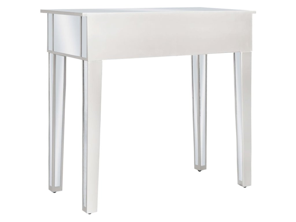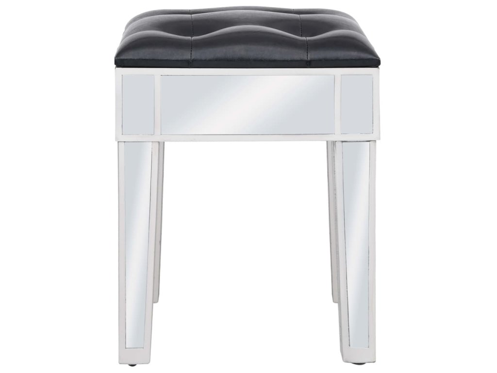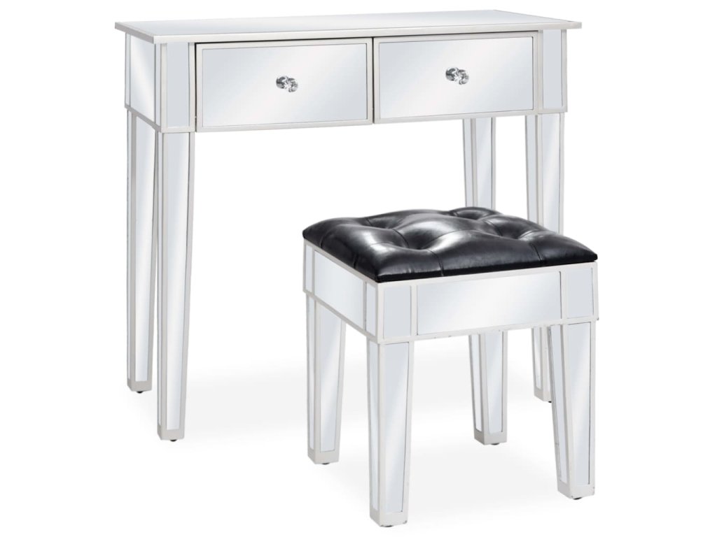 Tento stolík má zrkadlový povrch, vďaka ktorému okamžite skrášli interiér a priestor opticky zväčší. Úchytky s umelými kryštálmi dodávajú stolíku elegantný šmrnc a umožňujú jednoduché otváranie zásuviek. Sedadlo je čalúnené umelou kožou, ktorá mu dáva luxusný nádych a poskytuje maximálny komfort.