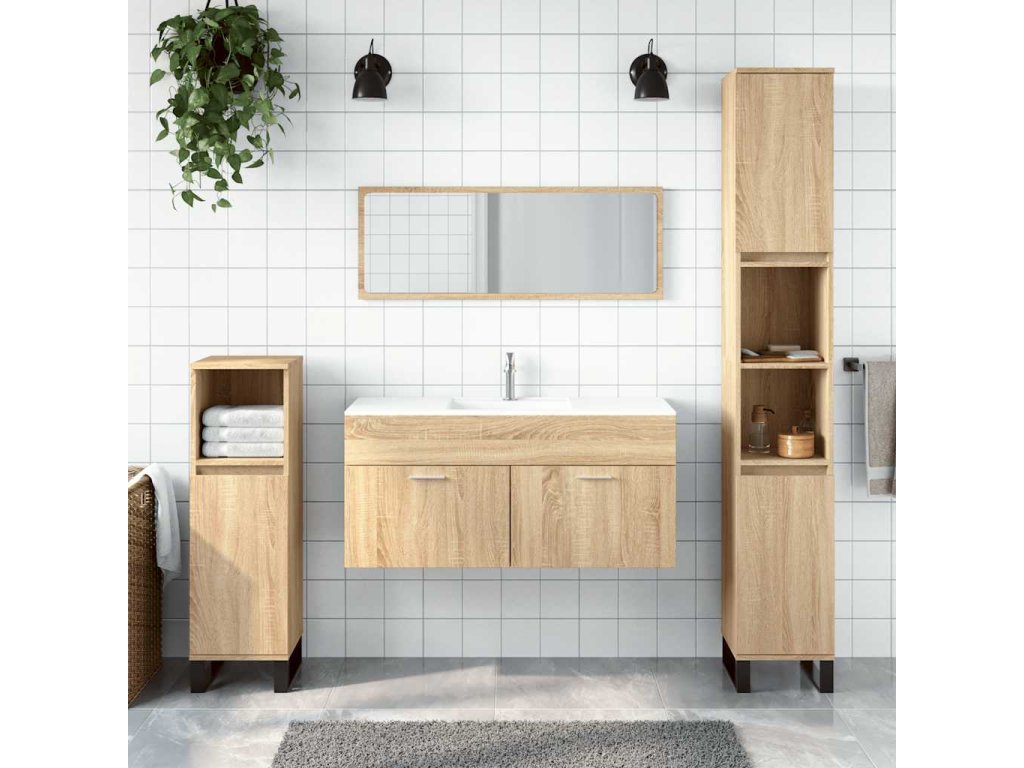 - Trvácny materiál: Spracované drevo je mimoriadne kvalitné s hladkým povrchom a vyznačuje sa pevnosťou, stabilitou a odolnosťou proti vlhkosti. Kúpeľňová skrinka je vyrobená z pevného kompozitného dreva, vďaka čomu je mimoriadne robustná a trvácna.