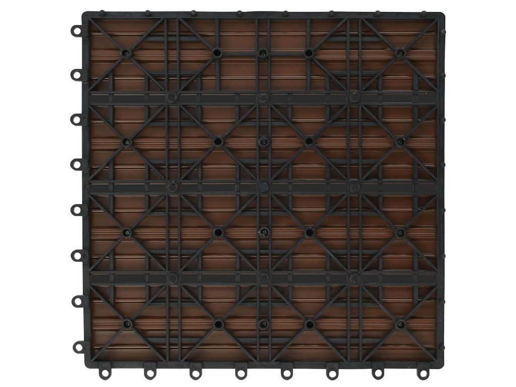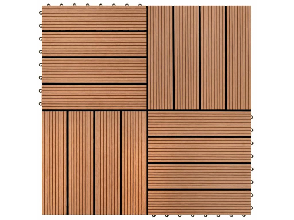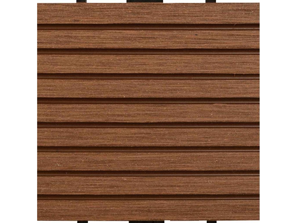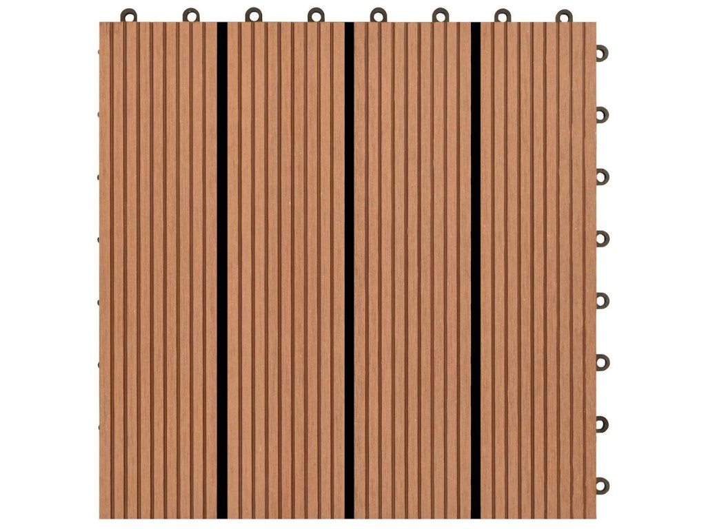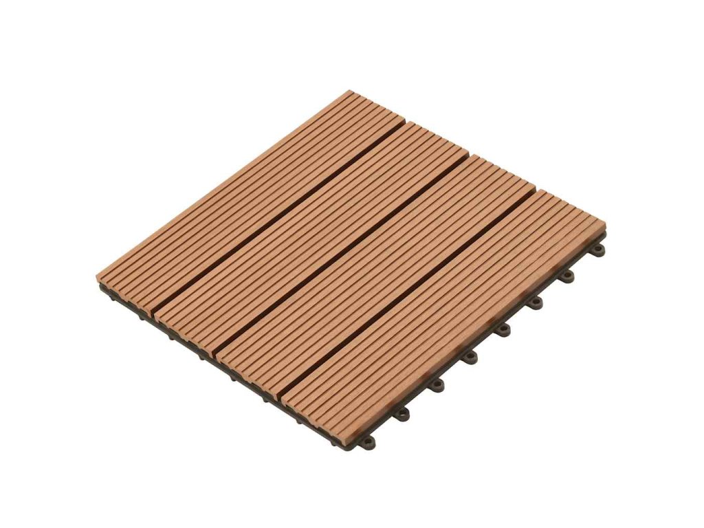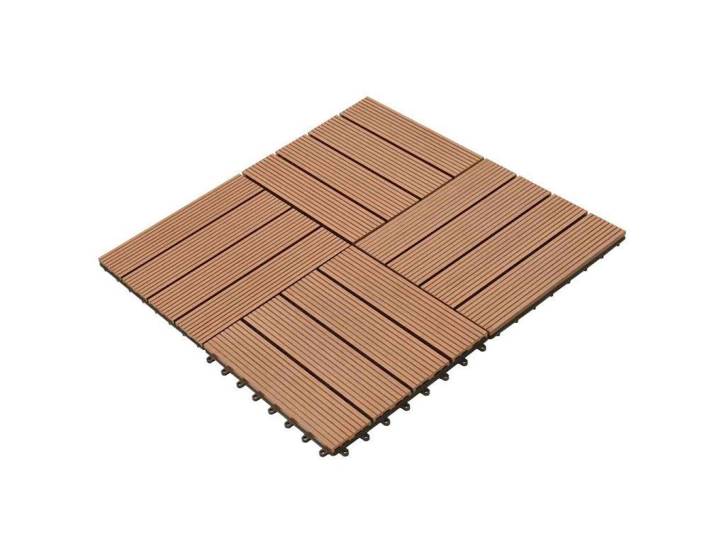 Táto sada WPC dlaždíc, každá 30 x 30 cm, je dodávaná s 11 ks a celková veľkosť je 1m štvorcový. Je ideálna pre terasy, balkóny, kúpeľne, bazény alebo kúpele.